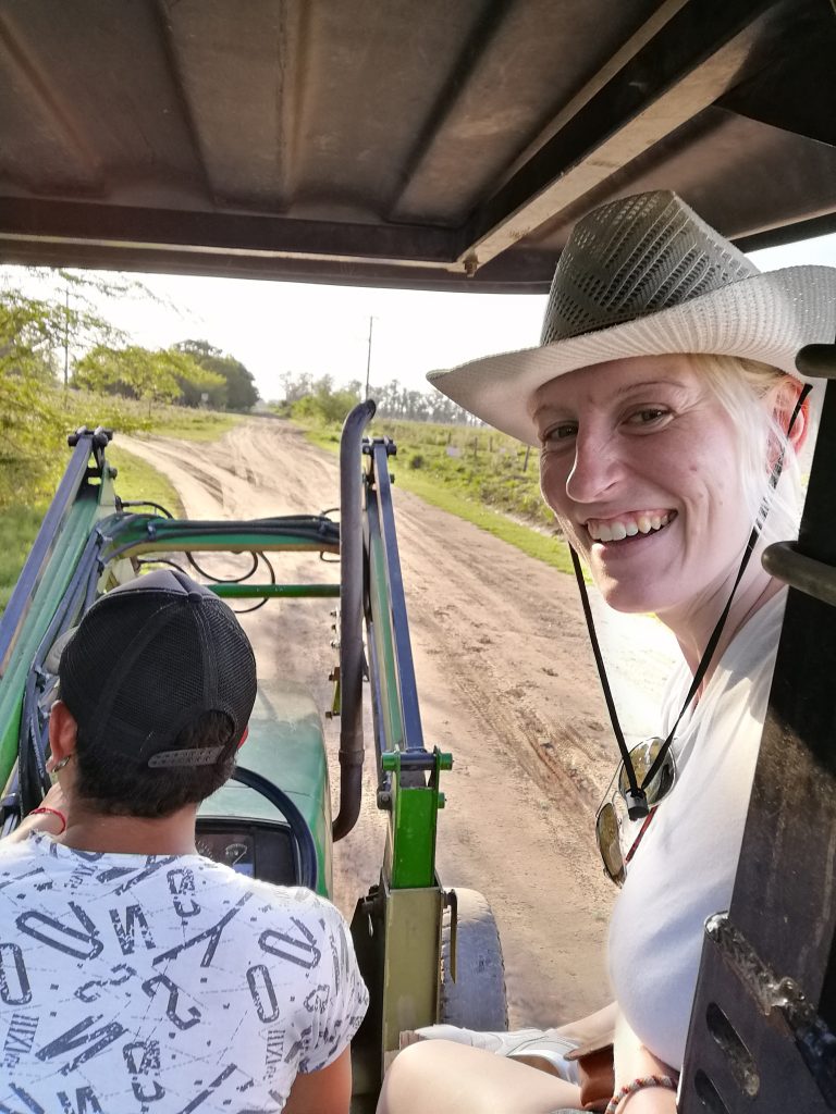 … Das Motorengeräusch wird lauter und kommt hinter mir zum Stehen. Ich drehe mich um und lächle. Die vertrauen grün-gelben Farben von John Deere sind wie ein Gruß aus der Heimat. So einen nur in größer hatten wir jahrelang zuhause. Der kleine freundliche Argentinier fragt mich, wohin ich will. Zur Palo Alto Polo Farm. Er grinst, dachte er sich schon. Da muss er auch hin. Spring auf, ich nehm dich mit.