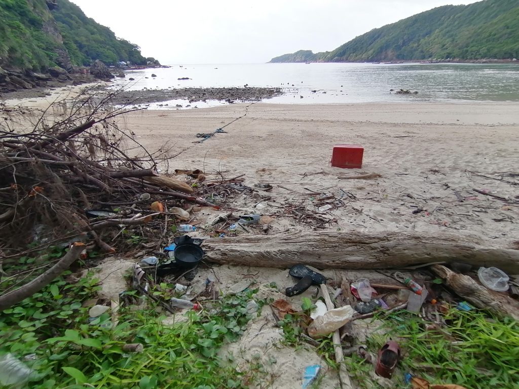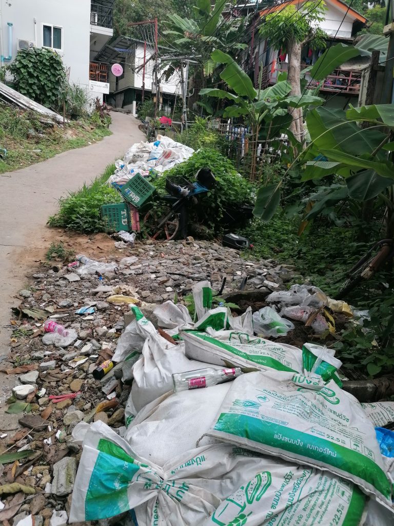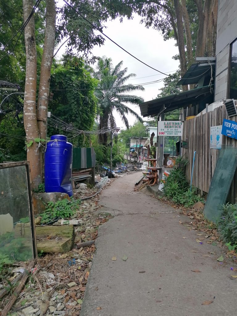 Aber zugegeben, ich bin gerade auch ein seltsamer Anblick mit meinen Wanderschuhen zwischen den ganzen Bade- und Partygästen. Mit der Zeit wird die Straße, der ich folge leerer. Und dann merke ich, dass ich in die „echte Welt“ von Ko Phi Phi komme, denn plötzlich spaziere ich an einem Stinkenden, sehr verunreinigten Fluss vorbei und rechts und links türmt sich der Müll. Die Häuser werden ärmer und die Leute thailändischer.