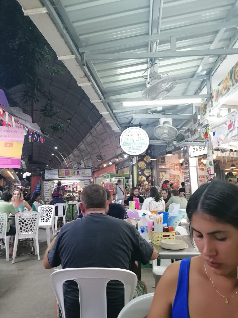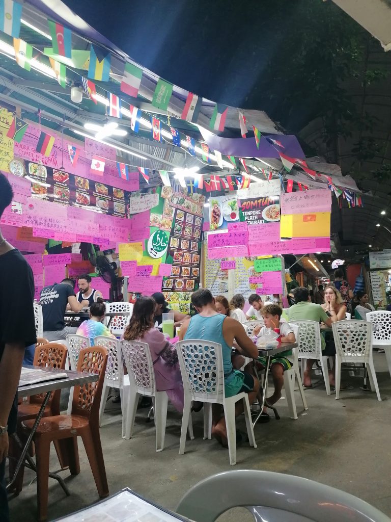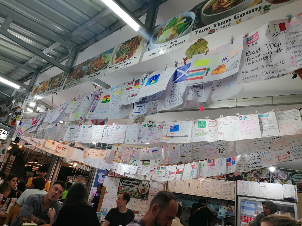 Ich packe meine Badetasche und mache mich dann auf den Weg die Insel zu erkunden. So viele Straßen gibt es ja nicht, ich folge einfach einer, die mich zur anderen Seite bringt. Dabei komme ich durch eine riesige Halle, in der bestimmt zwanzig kleine Imbissrestaurants versuchen, die Leute zu sich zu locken: Die billige Fressmeile.