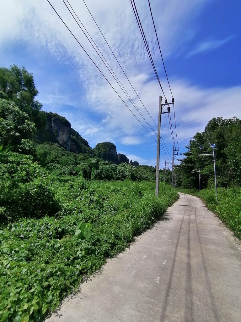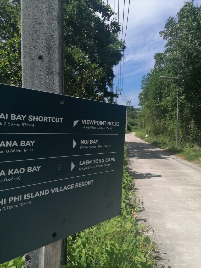 Man geht etwa 20min aufwärts über einen Hügel, dann wieder 20min abwärts und kommt auf der anderen Seite auf einer Straße wieder heraus. Wieder finde ich Schilder, die mit Zeitangaben in alle Richtungen zeigen. Sehr schön, danke Ko Phi Phi!