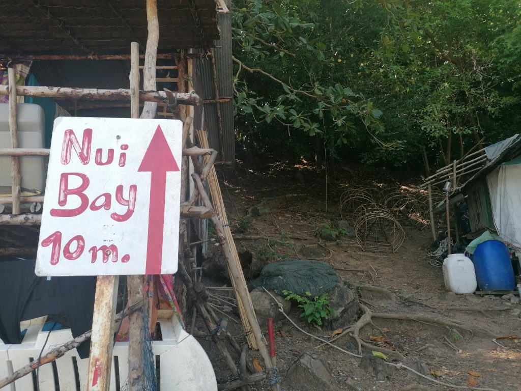 Für einen Moment muss ich mich orientieren, weil der Weg anzeigt, ich müsste abbiegen, aber ich erkenne keine Straße. Erst nach einer kleinen Suche finde ich den schmalen Pfad, der zwischen zwei Häusern hindurch führt und aussieht wie ein privater Eingang in einen Hinterhof. Aber kurz nach den Häusern führt der schmale Pfad nach unten zur Küste und führt dann hinter der Häuserreihe am Strand entlang. Und nach einer Weile verschwinden die Häuser und ich bin wieder allein mit der Natur, so wie ich es gerne hab. Ich wandere über die steinige Küste und entdecke nach einer Weile sogar ein Schild, das in den Wald zeigt und auf dem „Nui Bay“ steht. Da will ich hin.