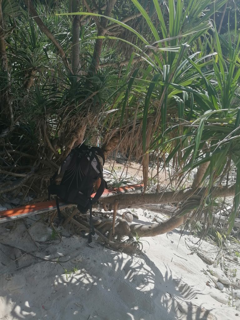 Das einzig Doofe: Es gibt kaum Schatten und die Sonne knallt herunter. Die wenigen Ecken, in denen es etwas schattiger ist, sind natürlich längst besetzt, aber so lange in der Sonne werde ich es nicht aushalten. Nachdem ich eine Weile dumm durch die Gegend gucke und mit dicken Wanderschuhen am Strand stehe, fällt mir winziger Fleck ins Auge, der mir den Tag rettet: Eine kleine, krumme Palme ragt aus dem Wald hinter mir hervor und schafft damit genau genug Schatten für EINE Person: MICH!!! Jackpot!