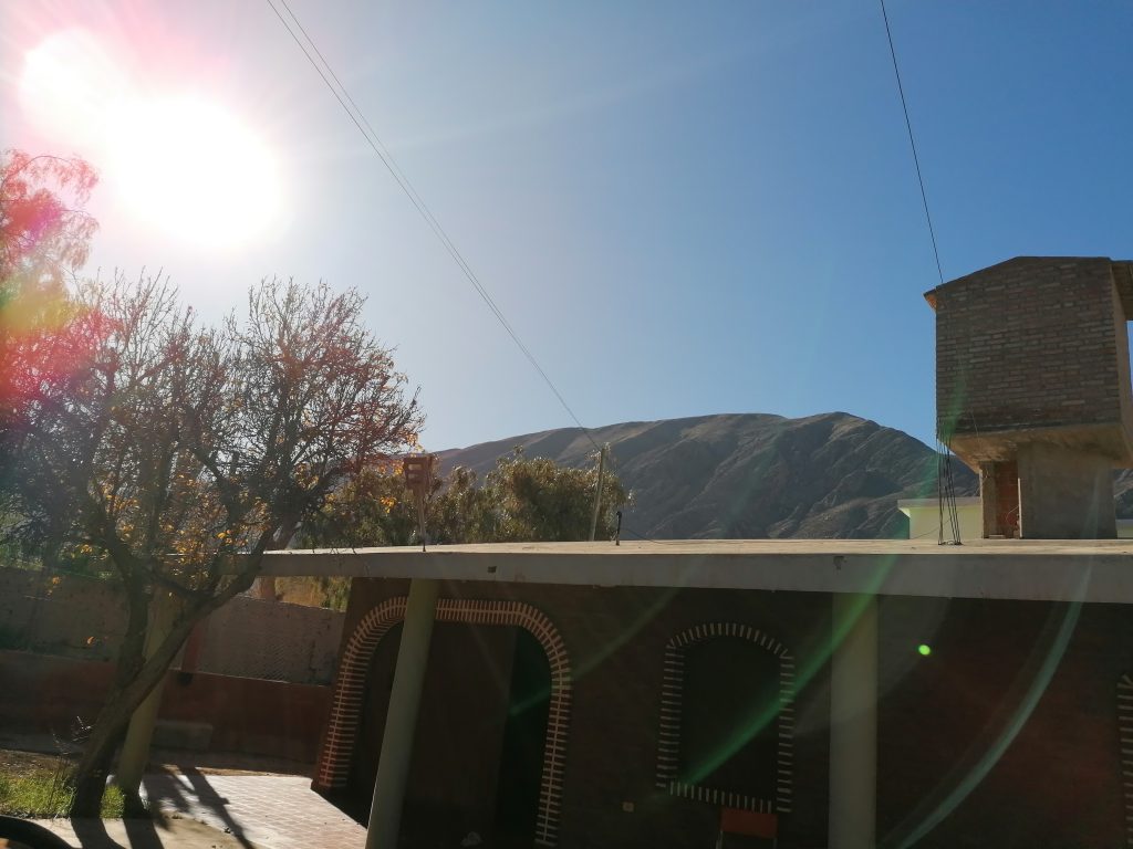 Leider klingelt unser Wecker schon wieder früh. Ich wache auf, fühle mich immer noch schlecht wegen des Fast-Unfalls und bin noch fertig von der langen Fahrt. Deshalb lasse ich zuerst alle anderen duschen und gehe als letzte ins Bad, während die anderen schon zum Frühstück gehen. Das Frühstück ist eher semi, ich esse nicht allzu viel. Danach kurze Besprechung, was heute unser Tagesziel ist. Chris möchte auf jedenfall Tilcara sehen, das nächste Dorf auf der Strecke nach Purmamarca. Das bietet sich an, am ersten Teil des Tages zu besichtigen, ich möchte gerne am Spätnachmittag in Humahuaca ankommen, um dort vielleicht noch das(den?) Hornocal zu sehen, den vierzehnfarbigen Berg. So bleiben wir ungefähr im Zeitplan, um die Iruya-Wanderung zu machen. Alle stimmen zu und wir packen unsere Sachen. Die Sonne scheint, der Tag scheint vielversprechend und tatsächlich ist der Ausblick von unserer Unterkunft nicht schlecht: