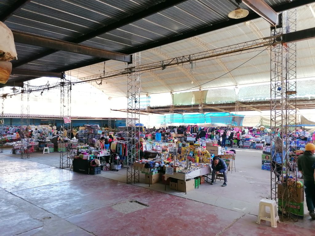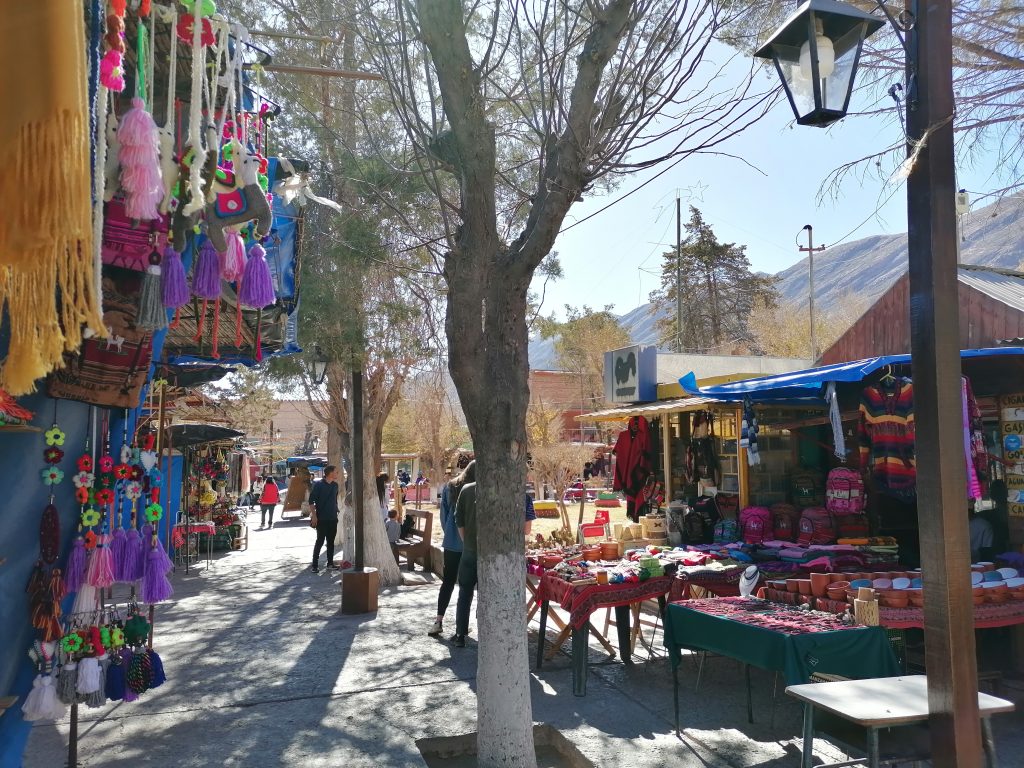 Es ist ruhig. Schön ruhig. Sonst ist der Ort wahrscheinlich völlig überlaufen von Touristen, jetzt ist durch die Blockaden kaum was los. Wir schlendern durch die Straßen, entdecken weiter hinten sogar einen Fußballplatz. Da schreiben Chris und Anne, sie sind durch die Blockade und haben das Auto in der Stadt geparkt. Wir finden uns schnell und gehen dann in Richtung Stadtmitte. Der Plaza dort ist ein einziger Handwerkskunstmarkt. Man findet an vielen Ständen ein bisschen dasselbe, aber vor allem ist des bunt. Die Farben gelb, rosa, rot, blau springen einem von den vielen bunten Mützen, Handschuhe, Zopfhaltern, Armbändern, Schals und Ponchos entgegen, dass man am liebsten einen Großeinkauf machen würde.