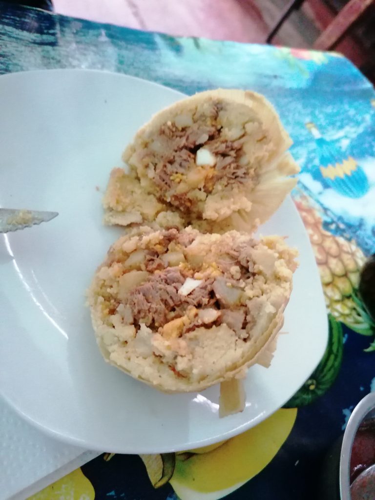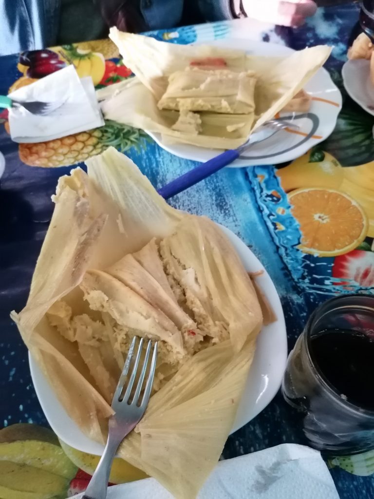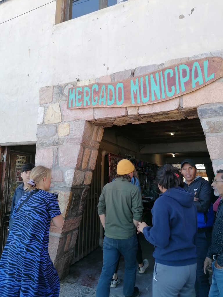 Zuerst gehen wir aber größtenteils dran vorbei zum Mercardo Municipal, der in einer großen Halle gleich nebenan liegt. Dort werden eher alltägliche Sachen verkauft, aber wir wollen vor allem wegen des Essens hin. Katrine hat einen Tipp bekommen, dass einem hier irgendwo einfach Empanadas in die Hand gedrückt werden. Diese Verkäuferin suchen wir und wir werden fündig. Ganz hinten winkt uns eine Frau und drückt jedem eine kleine Käseempanada in die Hand. Wir beschließen, gleich zu bleiben und zu essen. Es werden noch Empanadas bestellt und Humitas – ein klassisches Gericht, dass auch in Bolivien und Peru zu finden ist. Dabei handelt es sich um ein Maispüree, eines mit Fleisch, eines ohne und stets eingewickelt in das eigene Maisblatt. Beide schmecken köstlich!