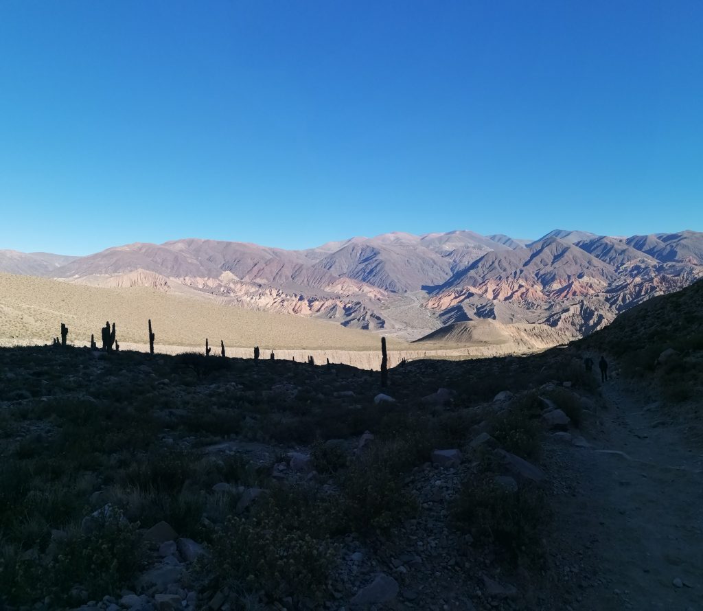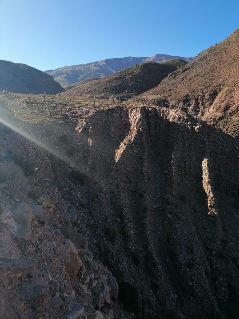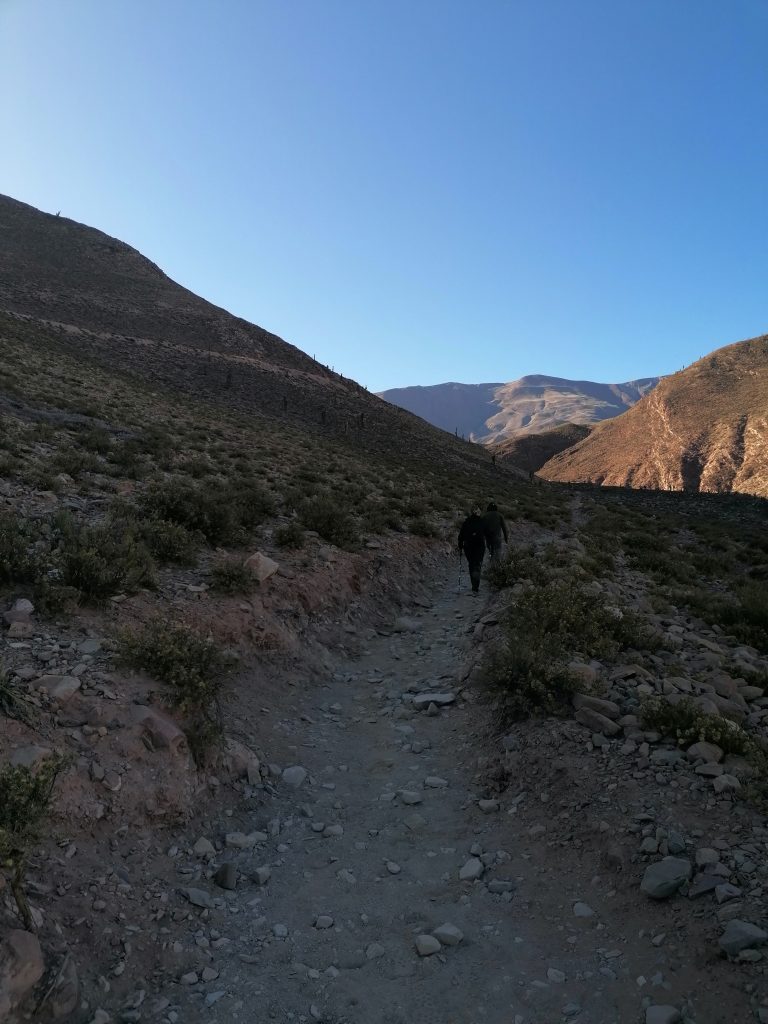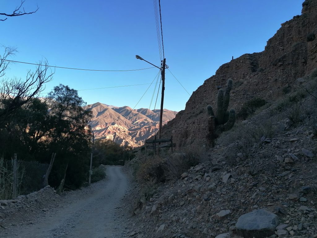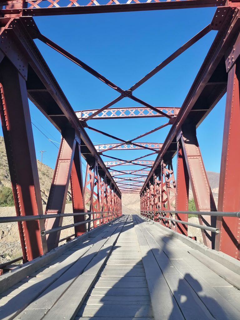 Nach einer gut durchgeschlafenen Nacht sieht die Welt schon wieder anders aus. Katrine hat eine kleine Wanderung geplant und ich fühle mich heute fit genug, sie zu begleiten. Chris ebenso. Wir frühstücken eine Kleinigkeit und fahren dann VOR der Blockade auf einen kleinen Parkplatz, wo wir das Auto zurücklassen. In Tilcara gibt es wieder die Tortas Fritas und wir gönnen uns jeder noch eins, bevor es losgeht. Der Weg führt uns zunächst durch die Stadt nach oben. Wir kommen an einer schönen alten Brücke vorbei, machen ein paar Fotos und stellen dann fest, dass das rustikale Ding offensichtlich noch gut genutzt wird, weil uns einige Autos weghupen.