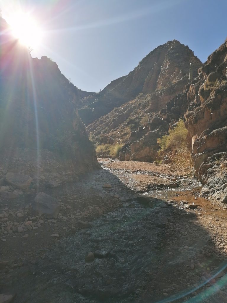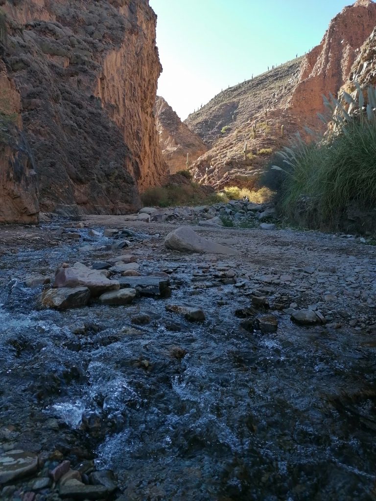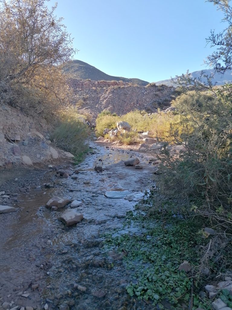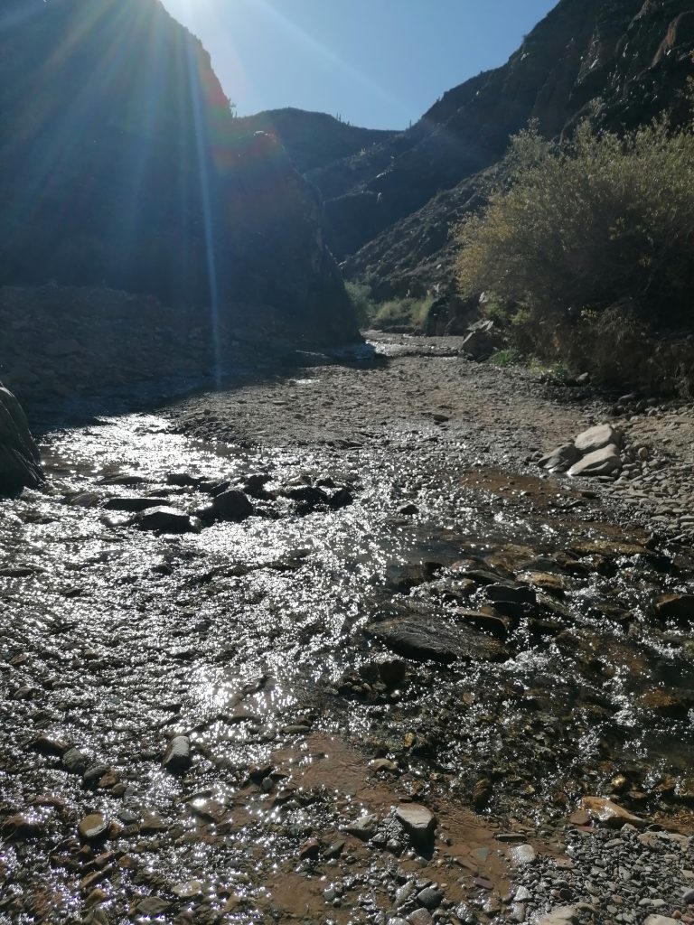 Wir machen Fotos, setzen uns, genießen den Anblick, essen, trinken Mate, unterhalten uns. Allerdings wird es ohne Bewegung bald frisch im Schatten und so nahe am kühlen Nass, sodass wir uns doch wieder auf den Rückweg begeben. Nicht ohne nochmal richtig den Weg über den Fluss zu genießen. Vor allem diese bunten Steine, die vielen Mineralienfarben aus den Anden, davon kriege ich nicht genug.