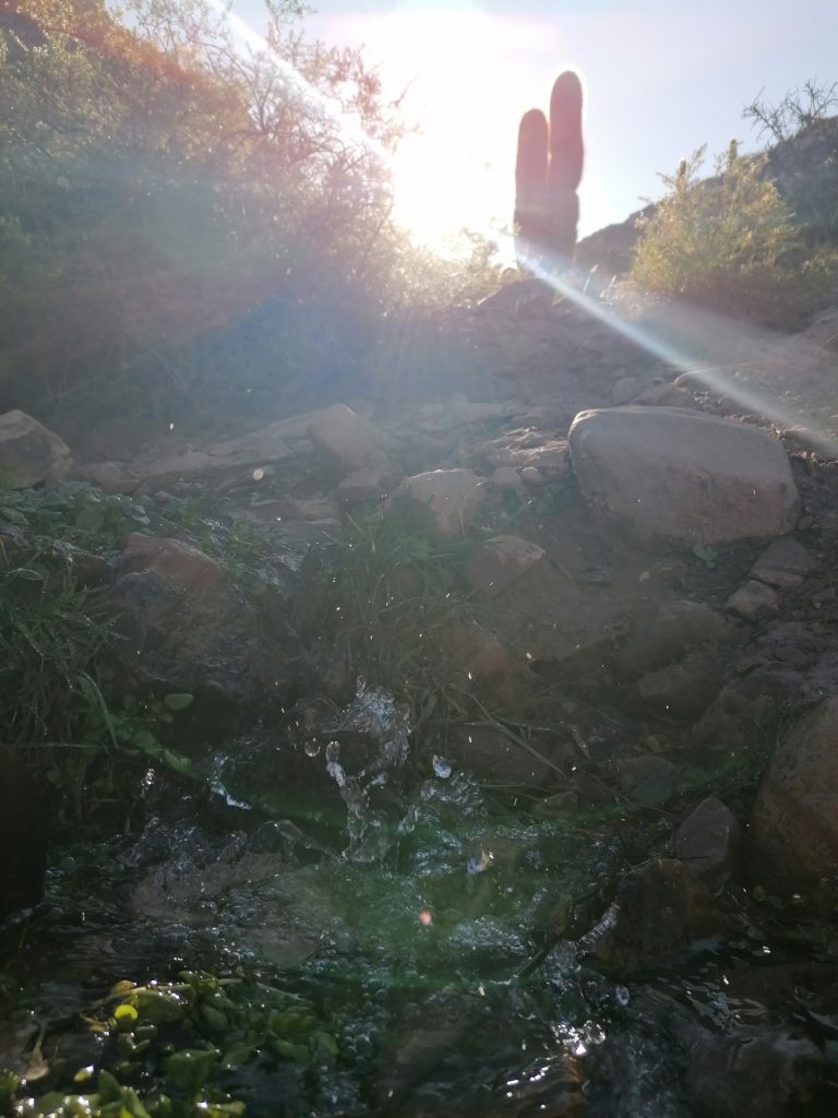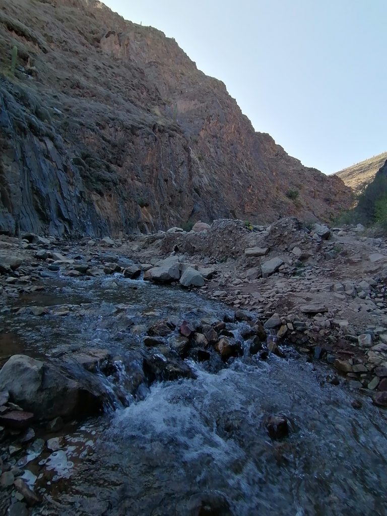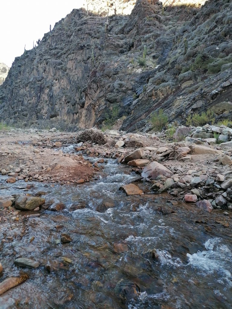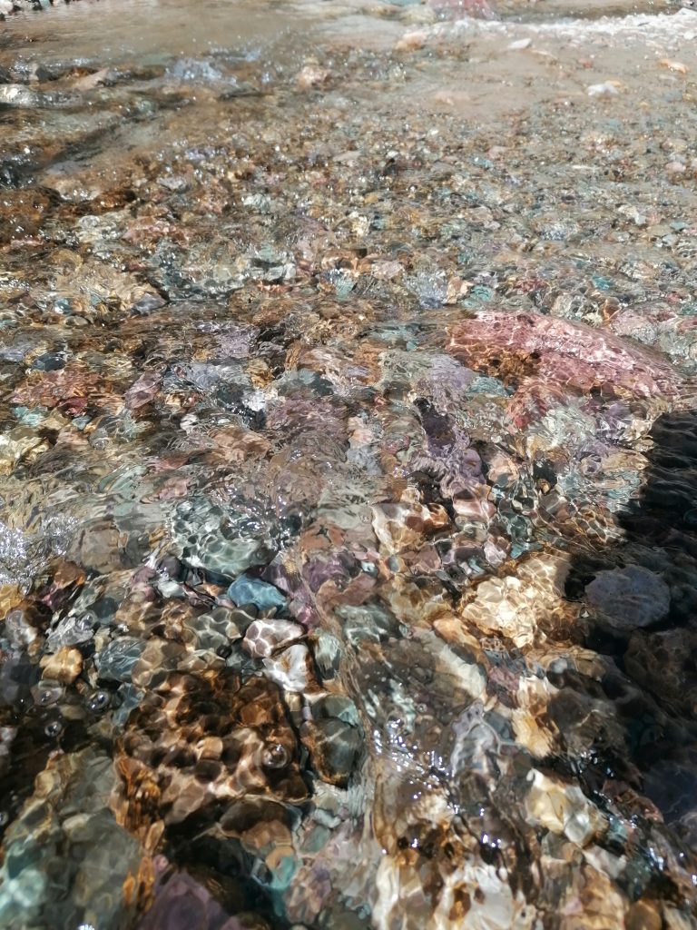 Wir machen Fotos, setzen uns, genießen den Anblick, essen, trinken Mate, unterhalten uns. Allerdings wird es ohne Bewegung bald frisch im Schatten und so nahe am kühlen Nass, sodass wir uns doch wieder auf den Rückweg begeben. Nicht ohne nochmal richtig den Weg über den Fluss zu genießen. Vor allem diese bunten Steine, die vielen Mineralienfarben aus den Anden, davon kriege ich nicht genug.