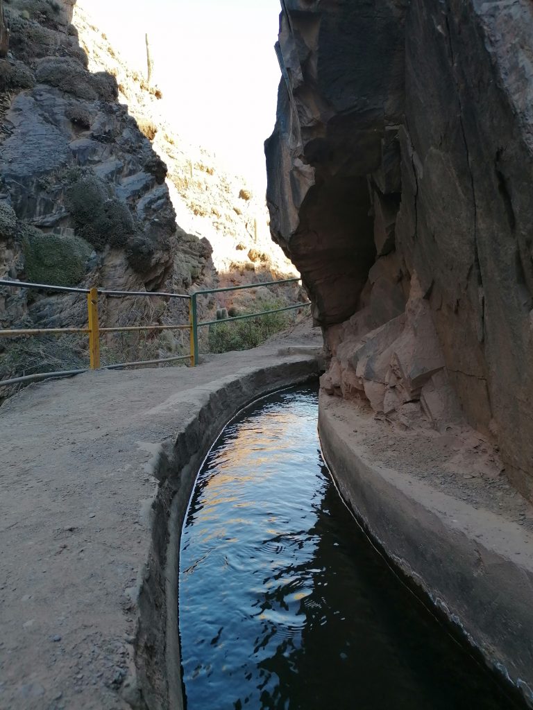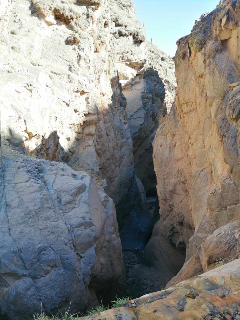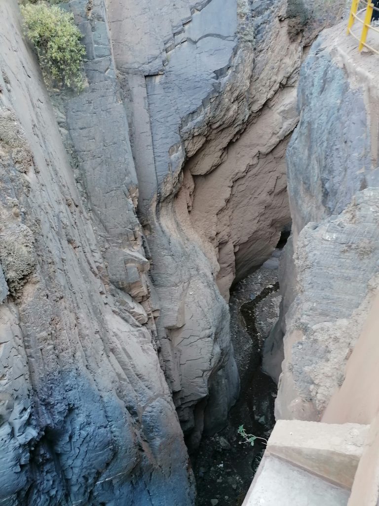 Wir bleiben größtenteils im Schatten, die Sonne hier oben hätte das Erlebnis sehr schnell deutlich anstrengender gemacht. Nach etwa einer knappen Stunde erreichen wir schon den Ausgangspunkt unseres eigentlichen Ziels. Die… also eine (es gibt wirklich viele davon) „Garganta del Diablo“ (Teufelsschlund). Eine riesige Schlucht, bei deren Anblick einem schwindlig wird, unten fließt ein kleiner Fluss.