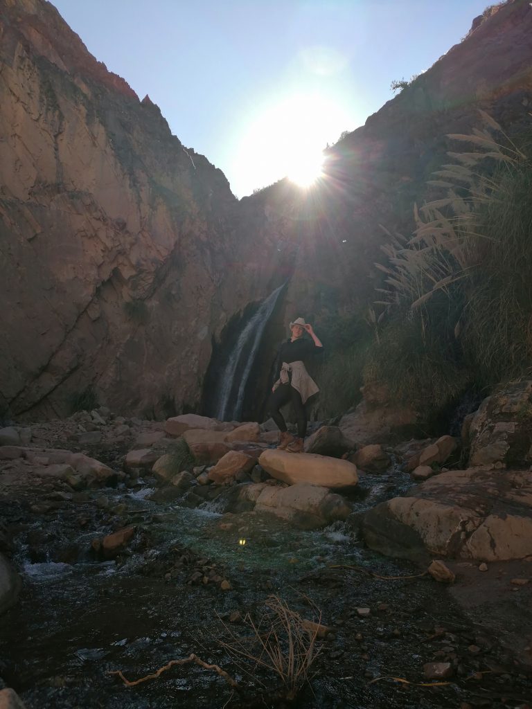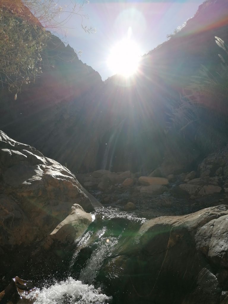 Dort kommt man aber nicht viel weiter, deshalb gehen wir bald in die andere Richtung, den Fluss entlang. Hier ist es relativ flach, steinig und wir müssen den kleinen Wasserstrom mehrfach überqueren… aber es ist so schön, dass ich die Kamera kaum weglegen kann, auch wenn es 100-Mal dasselbe Bild ist. Die Sonne strahlt von oben die Gräser an, die senkrecht an der Schlucht wachsen und fällt auf das Wasser, wo sich das Licht in glitzernden Strahlen bricht. Die Idylle ist zu perfekt, der Ort hat etwas Magisches.