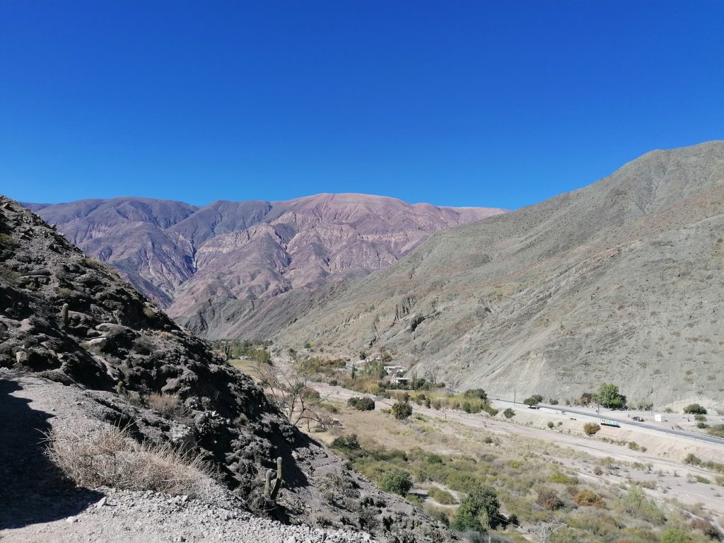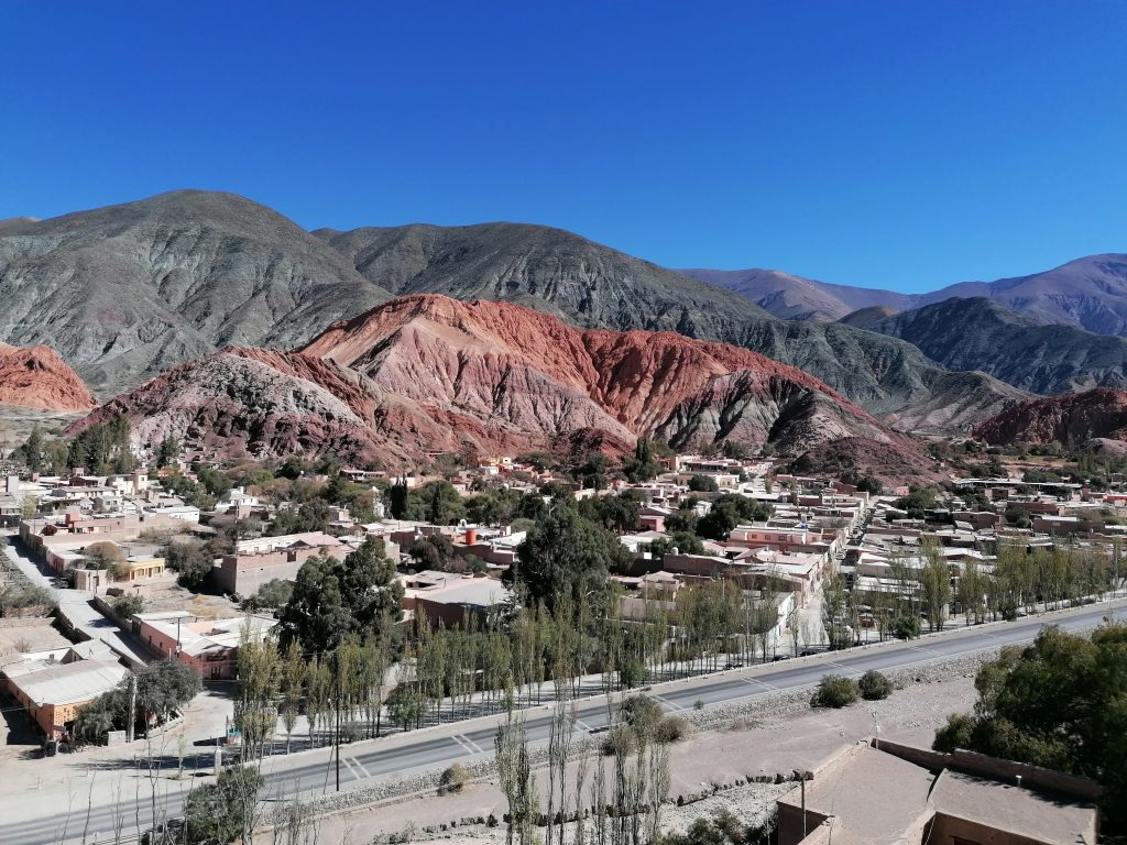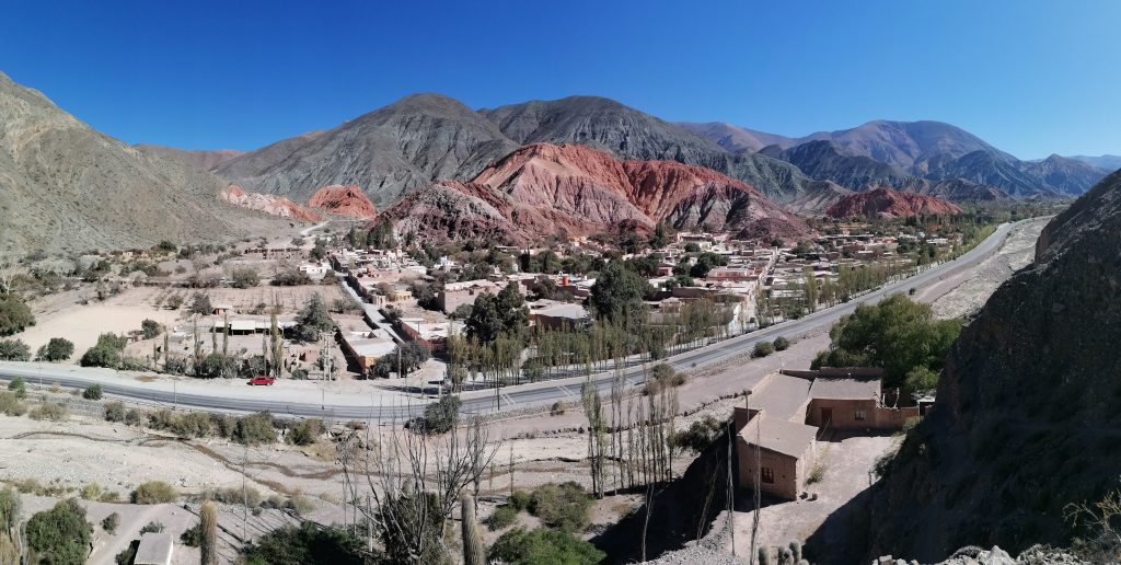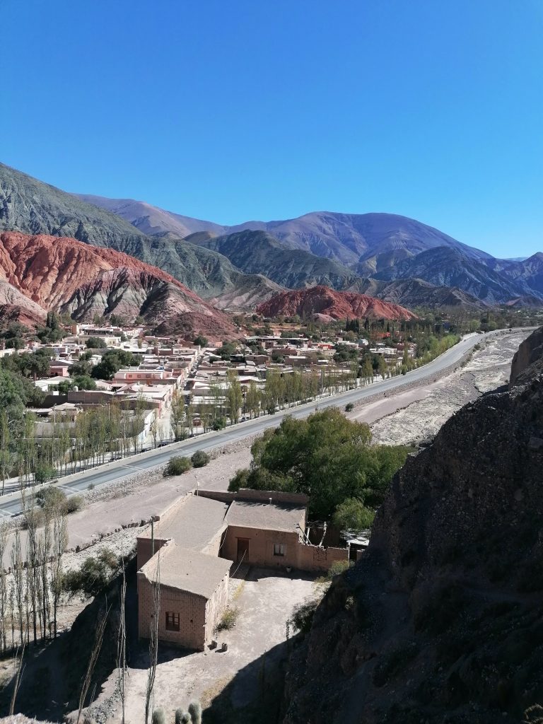 Anne hat im Internet einen kleinen Aufstieg zu einem Aussichtspunkt entdeckt, den klettern wir nach oben und haben so einen schönen Ausblick aufs Dorf… und vor allem auf die Berge, die dahinterliegen. Ähnlich wie das/der Hornocal ist Purmamarca für seine bunten Berge bekannt. Es ist wirklich unglaublich. Ein riesiger roter Felsen macht den Anfang, doch der Farbmix mit Rosa, Gelb, Orange zieht sich bis tief ins Gebirge dahinter.
