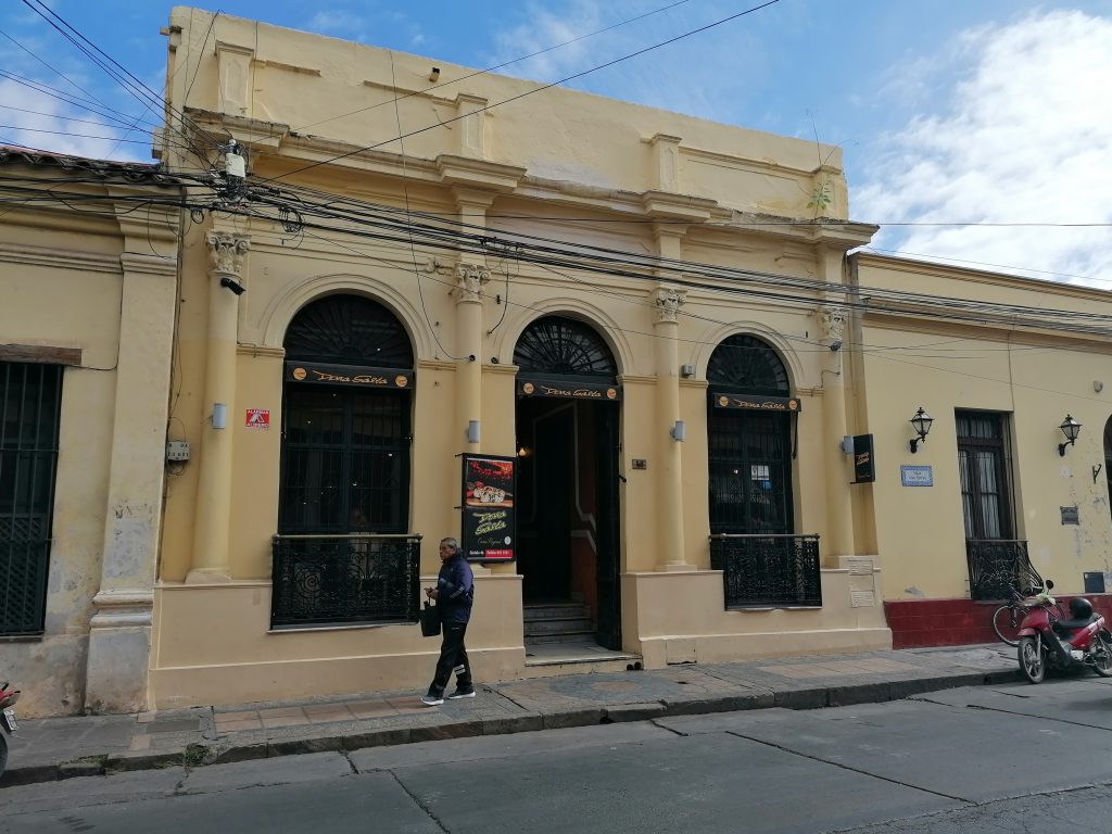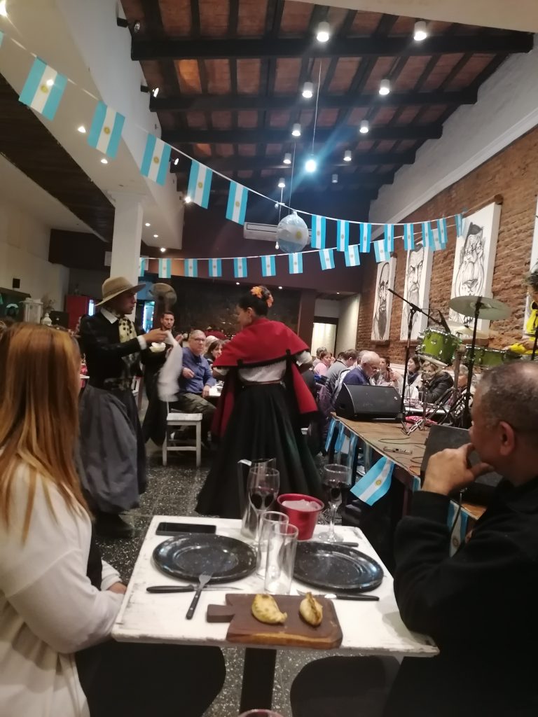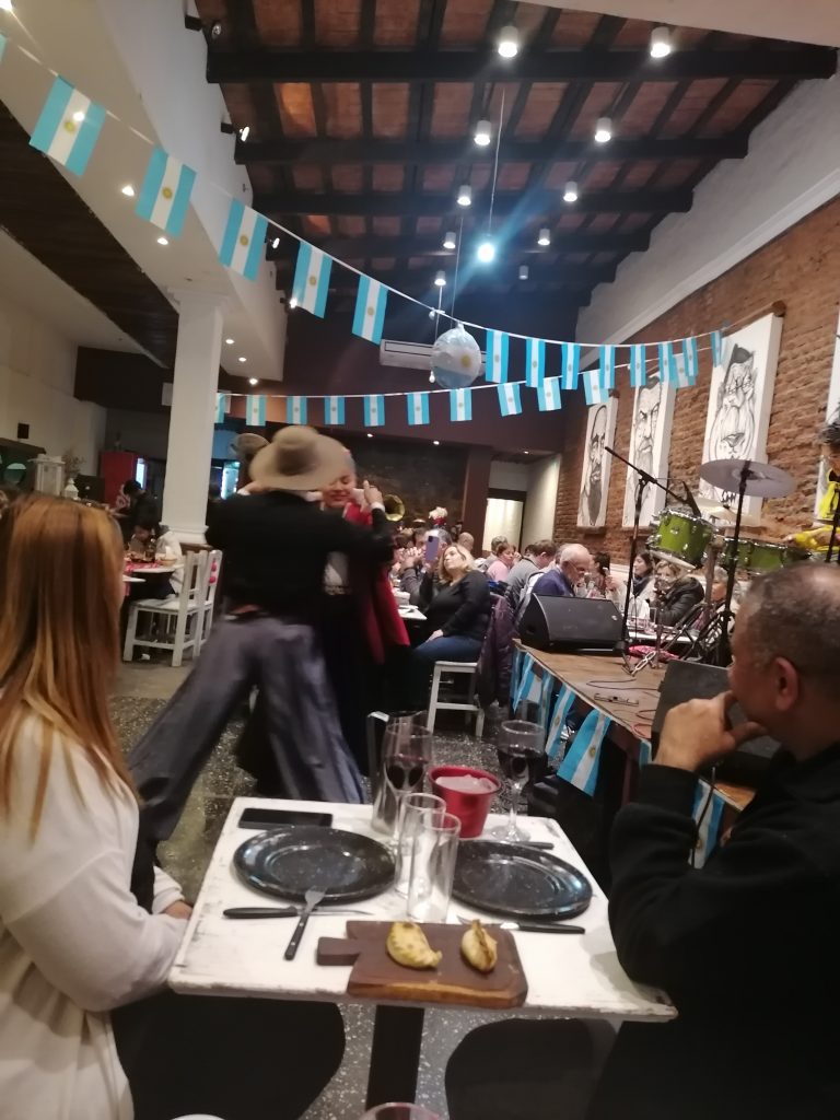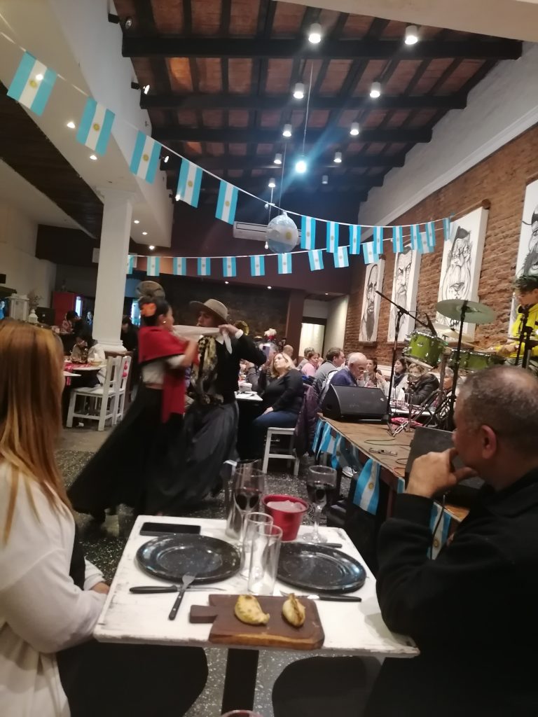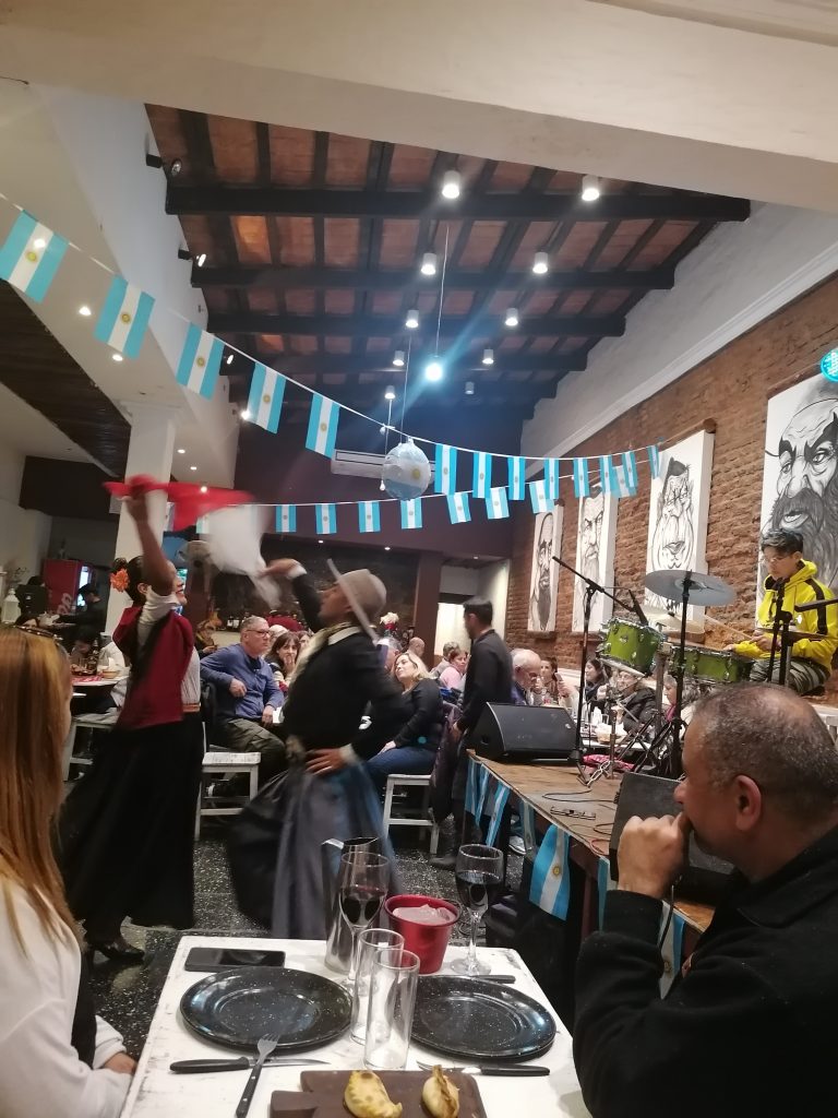 Wir laufen quer durch die Altstadt, die Peñas tummeln sich offenbar in hauptsächlich zwei Straßen in Salta. Sobald wir dort angelangen, werden wir von allen Seiten angesprochen und eingeladen. Wir entscheiden uns für eine, setzen uns, die Show geht gleich los. Auf der Bühne sitzen ein Gitarrist und eine Schlagzeugerin, die im ganzen Raum gute Stimmung verbreiten. Davor ist ein bisschen Freiraum, wo kurz darauf die Tänzer auftreten und einen spannungsgeladenen Tuchtanz in traditioneller Kleidung vorführen. Sie sehen sich dabei immer in die Augen, es ist ein Flirt, ein umeinander werben auf besondere Art. Leider sind die Fotos da schlecht geworden, aber mei.