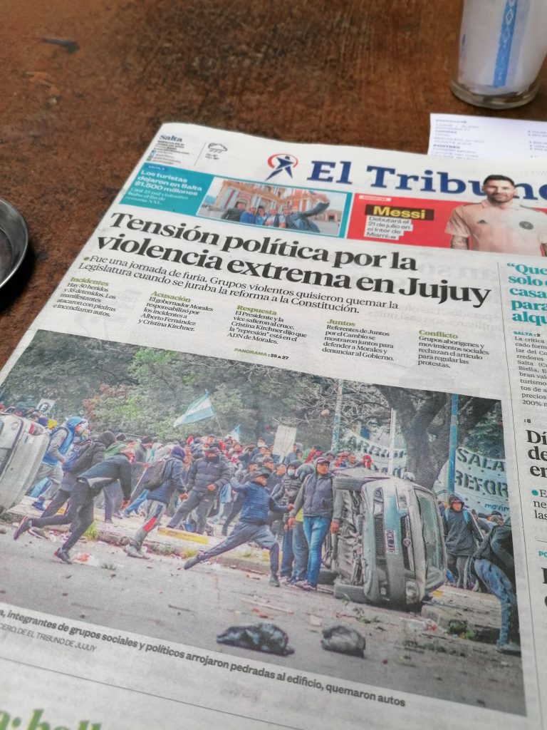 Auf meinem Tisch liegt eine Zeitung mit einem Artikel über die Proteste in Jujuy, der Provinz nördlich von Salta… unserem Reiseziel. Seit ein paar Wochen blockieren die Einheimischen dort die Straßen, um sich gegen eine schlechte Entscheidung ihrer Regierung zu wehren. Die ganze Sache sitzt mir tief in den Knochen, weil es das nicht einfacher macht, diese Region zu besuchen. Trotzdem wollen wir es probieren, da der Norden Argentiniens berühmt ist für seine Schönheit. Ich esse meine köstlichen Empanadas und mache mich dann wieder auf den Weg.