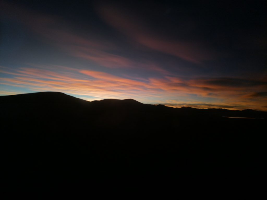 Wir holpern über die Steinhügelstrecke und tatsächlich sieht man irgendwann im Autolicht eine Rauchsäule aus dem Boden schießen. Ein Stück weiter sehen wir dann etwa drei Geisire, die Rauch auspusten… und beschließen einfach im Auto zu bleiben. Es ist wieder irre kalt und im Vergleich mit denen in Chile sind die hier echt nicht soo der Hammer. Für die anderen natürlich schon, das verstehe ich. Im Gegensatz zu Chile gibt es hier keine Abgrenzungen, keine Sicherheitshinweise. Da sieht man die Kulturunterschiede. Wir warten ab – lange dauerts nicht – bis die zwei Polen, die tatsächlich ausgestiegen, wieder im Auto sitzen, dann fahren wir weiter über die Steinhügelstrecke, dem Sonnenaufgang entgegen. Das ist ganz schön, aber wir stoppen nirgends für Fotos. Aber auch der Autoschnappschuss ist was geworden.