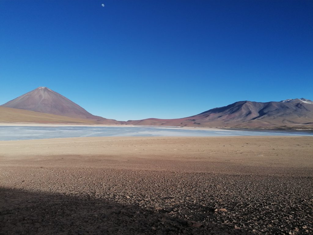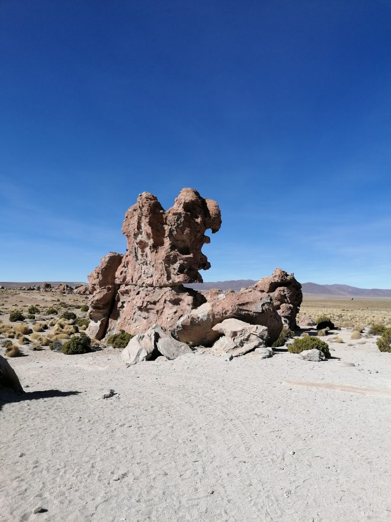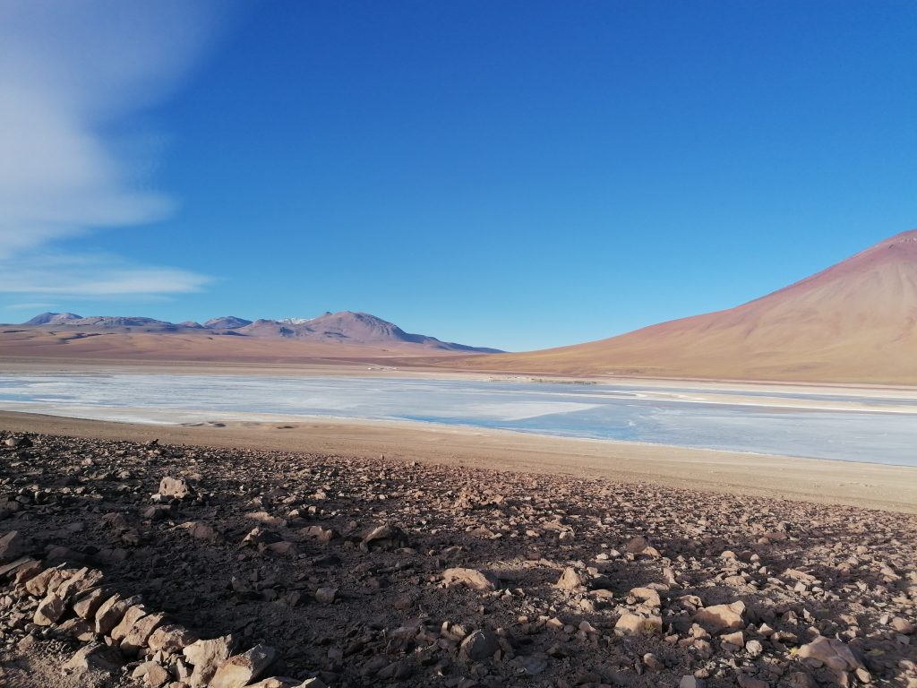Ich bin zwiegespalten von der Tour. Die Natur war unglaublich, aber es gab so viele negative Einflüsse, die uns diese drei Tage wirklich zu schaffen gemacht haben. Wir sind ziemlich müde. Ein Lichtblick ist der Typ vom Café, der wirklich sehr nett ist und mit dem wir ins Gespräch kommen. Ich hatte nach den bunten Ohrringen der Llamas gefragt und er erklärt, dass da nichts anderes als Ohrmarken sind, die meistens die Kinder jedes Jahr für die Llamas der Familie machen, sodass sie ihre Tiere auch wiederfinden. Seine Familie hat auch Lamas. Er erzählt, sein Großvater war oft tagelang mit den Lamas in der Wüste von Ort zu Ort unterwegs, er hat seine Seile selbst geknüpft und allerlei andere Produkte aus seinen Lamas hergestellt. Einige davon hat sein Enkel jetzt in seinem Llama-Café ausgestellt und zeigt uns die Seile und eine Tasche. Das Lama ist das wichtigste Tier hier in Bolivien, damit konnte man reisen, man hatte wolle, das Fleisch. Er erklärt, wie schön er es findet, wenn sein Bruder die Lamas zusammentreibt, die lange Zeit in den Bergen gegrast haben, um die Wolle zu holen oder den Bestand zu zählen. War ein richtig nettes Gespräch und ein richtig nettes Café. Außerdem hat er uns die bolivianische Variante von Kniffel gezeigt, die fanden wir aber nicht ganz so gut. Langweiliger und schwerer. Aber hey, immer mal was neues.