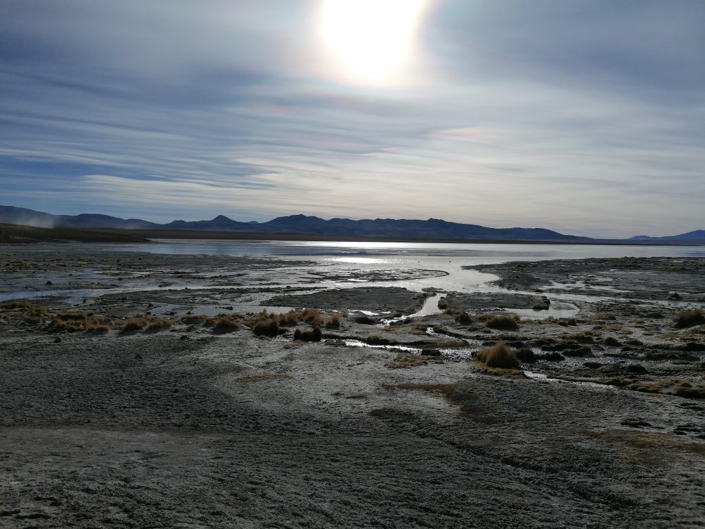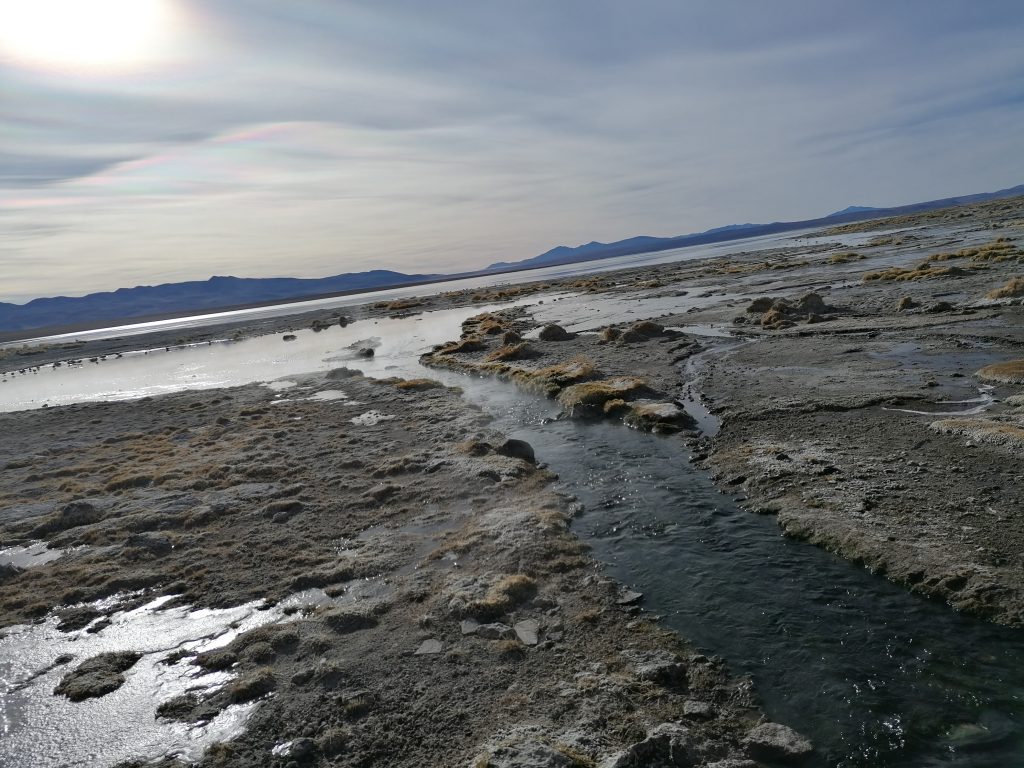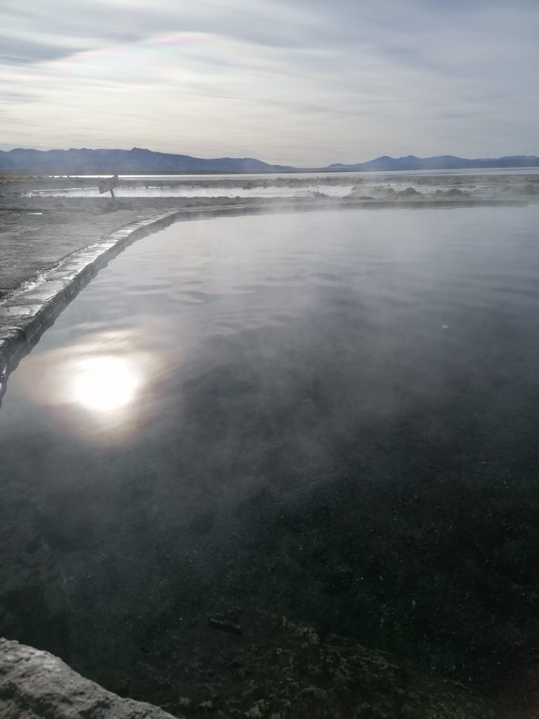 Danach geht es zu heißen Quellen, in denen man Baden kann. Viele nutzen die Gelegenheit, trotz eisiger Kälte draußen und springen ins Whirlpool warme Wasser. Auch Ale hält die Füße rein. Ich hab nicht so richtig Lust drauf und fühl mich außerdem ein bisschen schwindelig, vermutlich eine Kombination aus Höhe, wenig trinken und wenig Schlaf. Deshalb gehe ich ein bisschen spazieren, atme tief durch, genieße die Ruhe. Auch hier gibt es kleine Bäche, die die Temperatur der Badestellen haben. Schon faszinierend dieses Phänomen.