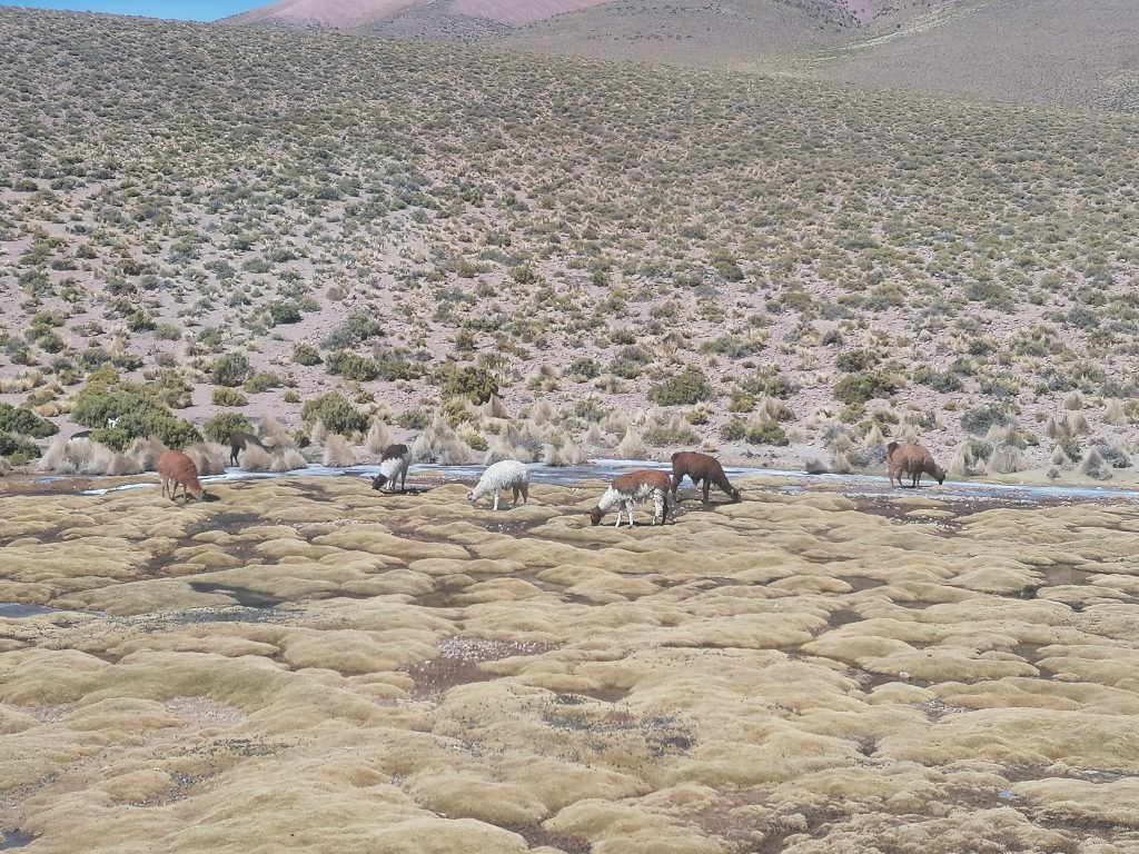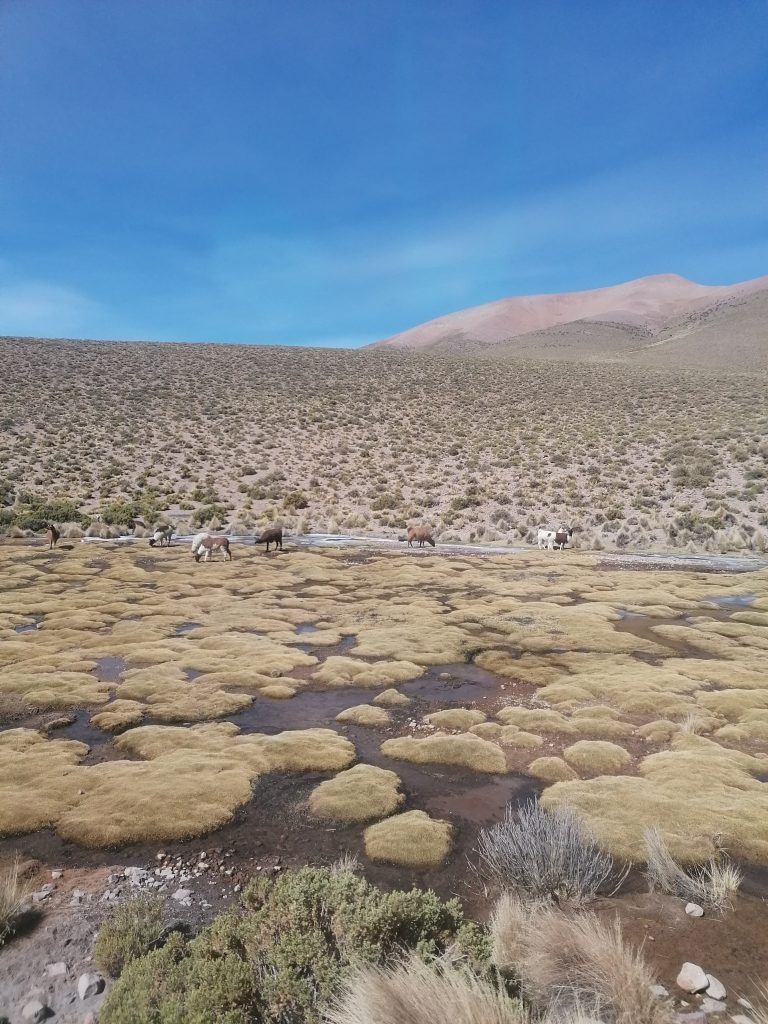 Vom nächsten Highlight kann ich leider nur schlechte Fotos machen, ich sitze auf der falschen Seite und wir halten nicht an. Während wir nach unten fahren, öffnet sich rechts von uns ein schmaler Streifen mit grünem saftigen Gras, durch den ein Gebirgsbach fließt… und dort grasen dutzende von Lamas, Alpakas und Vicuñas in allen möglichen Farben und Formen. Es ist ist wunderschön. Viele haben auch diese bunten „Ohrringe“ aus in pink, lila, gelb, grün. Total schön.