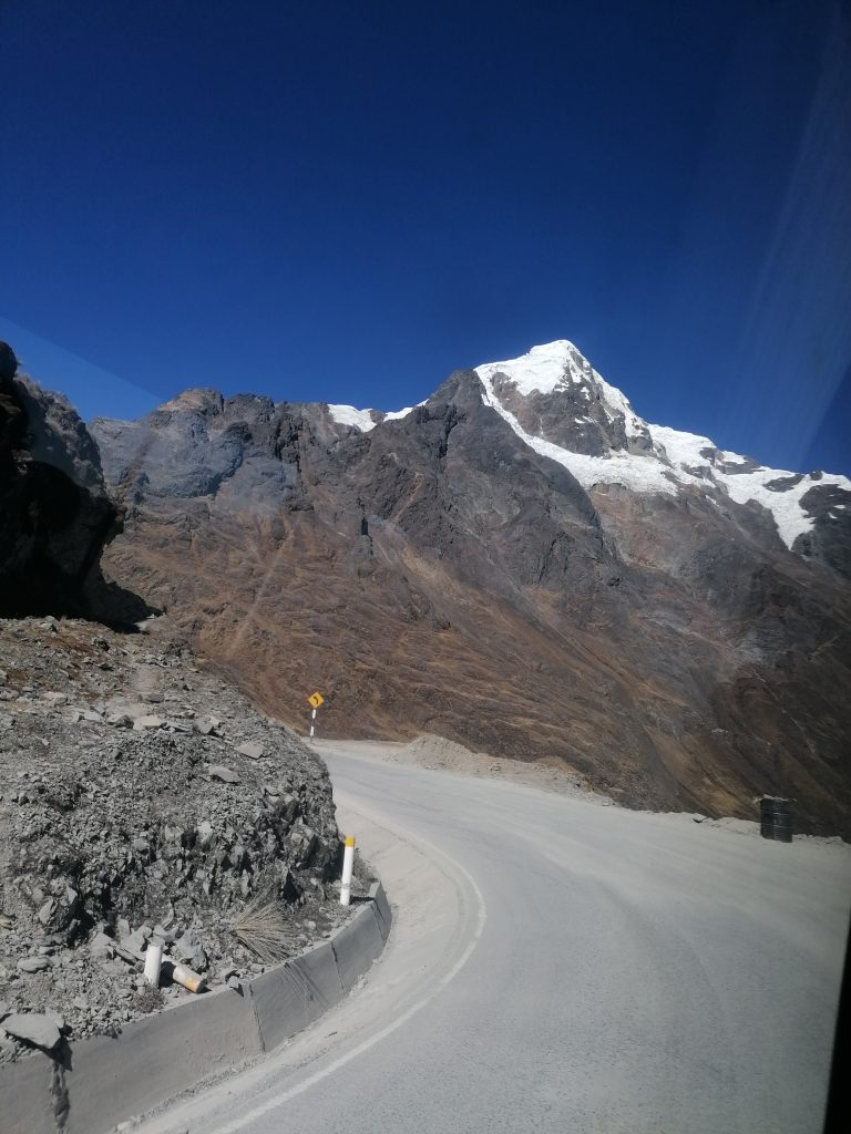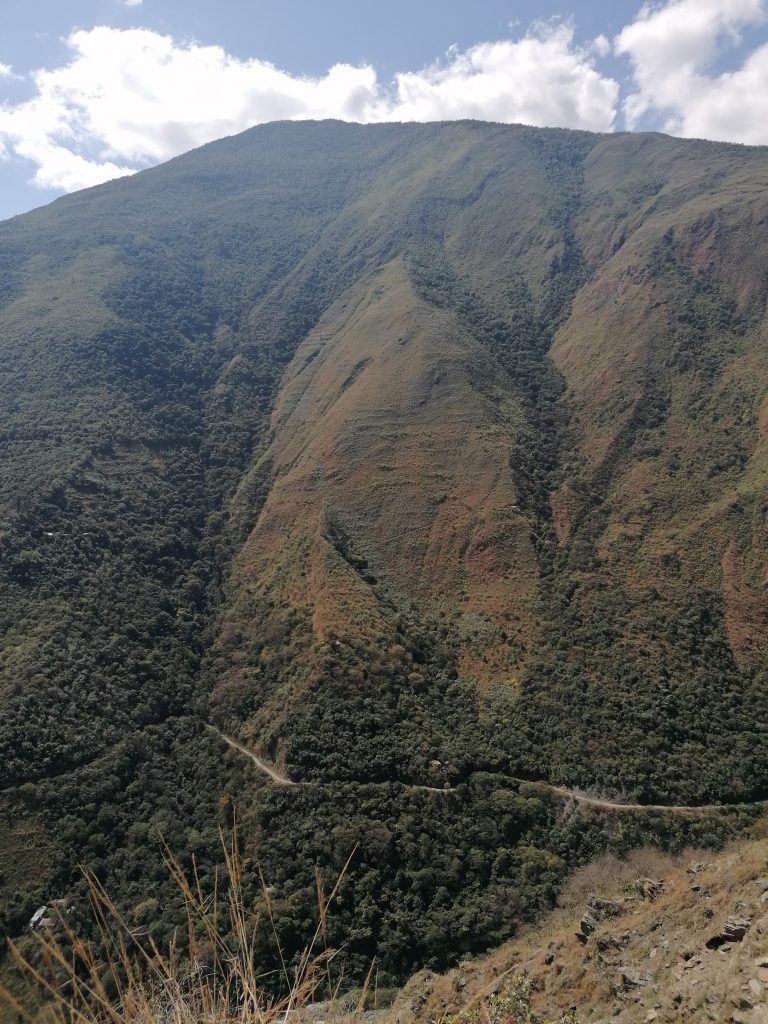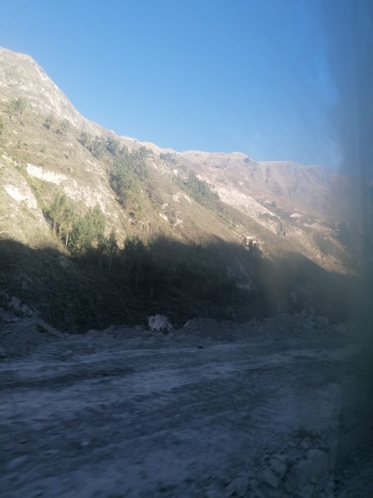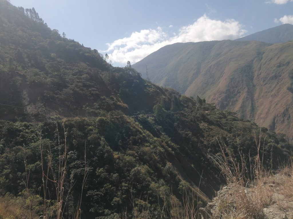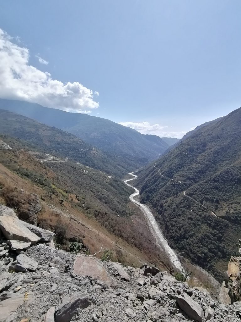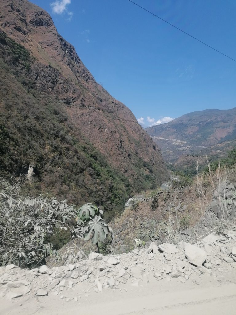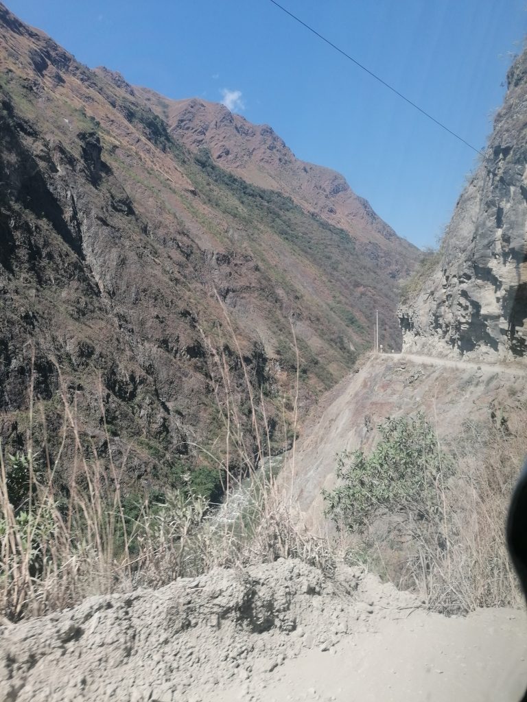 Zu Beginn ist die Straße noch okay, doch je tiefer wir in die Berge fahren, desto abenteuerlicher wird es. In Bolivien haben sich einige gewundert, dass wir die berühmte „Death Road“ nicht besuchen. Eine Straße, von der so viele Autos und Busse abgestürzt sind, dass sie (ich meine, jemand hätte erzählt, von den USA) saniert und für sämtliche Fahrzeuge gesperrt wurde. Heute kann man sie als Touri-Attraktion mit dem Fahrrad abfahren. Ich hab absolut gar nichts verpasst, sondern fahre hier und jetzt eine peruanische Deathroad in einem Minibus entlang. Der Ausblick ist gigantisch und weit… den 10 cm neben unseren Rädern hört der Boden auf und es geht hundert Meter in die Schlucht hinunter, wo der schöne Fluss entlangfließt. Außerdem ist überall Baustelle, weil die Straße offenbar gerade saniert wird (Hallelujah!), was das Abenteuer noch lustiger macht. Einige Stellen sind so schlammig und so knapp, dass sich der komplette Bus instinktiv nach links in Richtung Felswand lehnt. Ehrlich Leute, ich hab es nicht nur einmal mit der Angst zu tun gekriegt.