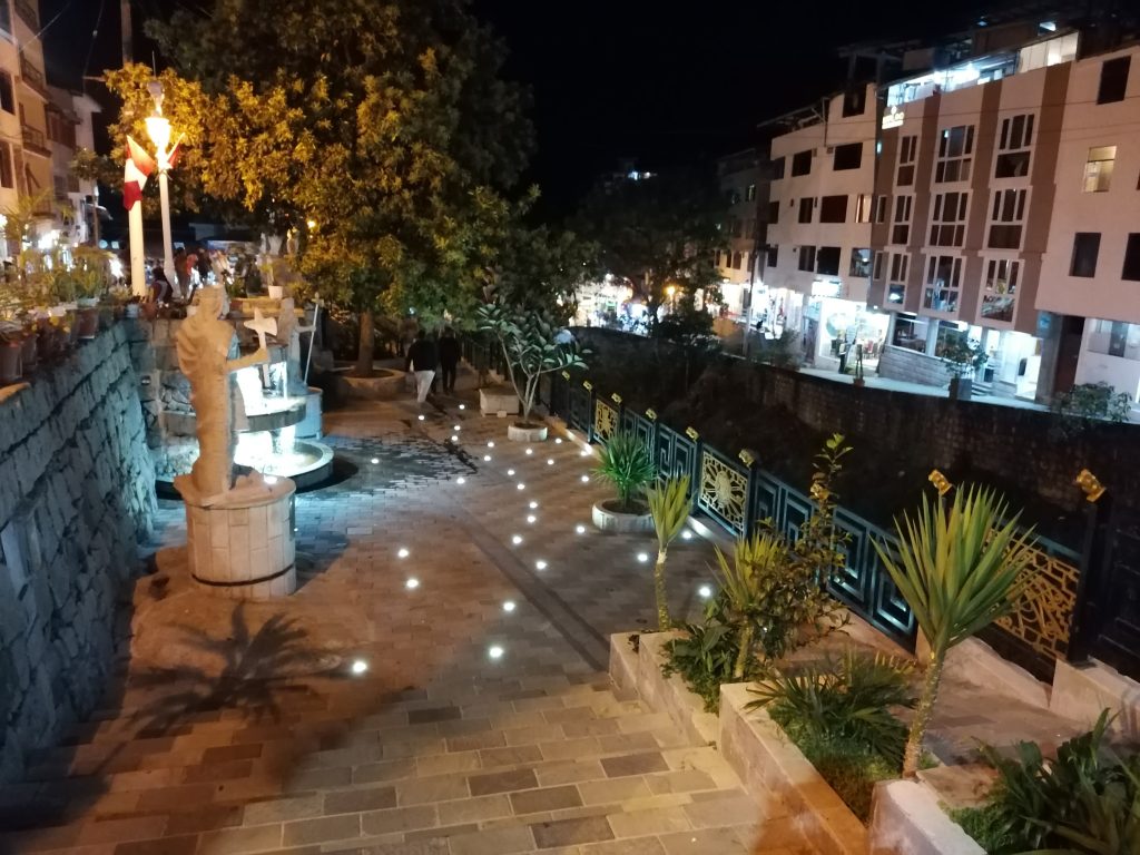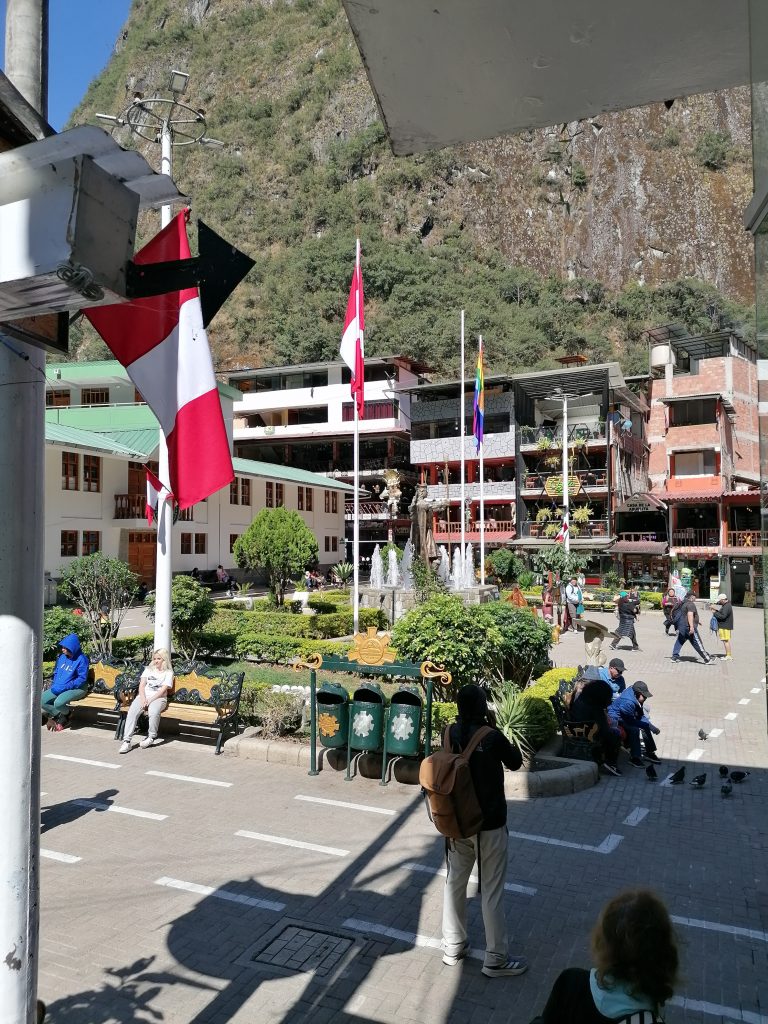 Der Weg ist total schön und bis auf den Anfang auch relativ flach. Die Natur hat sich in einen Tropenwald verwandelt, neben uns fließt der Fluss. Die Luft ist warm und ein bisschen feucht, aber nicht unangenehm. Bald müssen wir uns mit Mückenspray einsprühen, das ist der Nachteil, wenn man die Höhe verlässt. Zweieinhalb Stunden laufen wir durch die schöne Natur. Nach der langen Fahrt ist ein Bewegungsausgleich ganz schön, aber als wir dann ankommen, ist es auch genug. Es geht noch mal ein kleines bisschen bergauf auf eine größere Straße, auf der die Busse an uns vorbeipfeifen, die die Leute nach Machu Picchu fahren oder von dort holen. Das ist ein bisschen unangenehm, aber bald darauf sind wir im Dorf. Aguas Calientes oder Machu Picchu Pueblo. Von allen Seiten haben wir gehört, dass das Dorf völlig unspektakulär und einfach nur überteuert ist, reiner Touristenstopp. Vielleicht sind wir deshalb so positiv überrascht. Uns erwartet ein wunderschönes, sauberes Dorf, eingebettet in eine traumhafte Berglandschaft, der Gebirgsfluss bahnt sich mittendurch, die Gleise liegen über der Holzbrücke, überall Blumen… Natürlich hat das nichts mit der Realität zu tun, aber der Ort Aguas Calientes verzaubert uns beide im Handumdrehen.