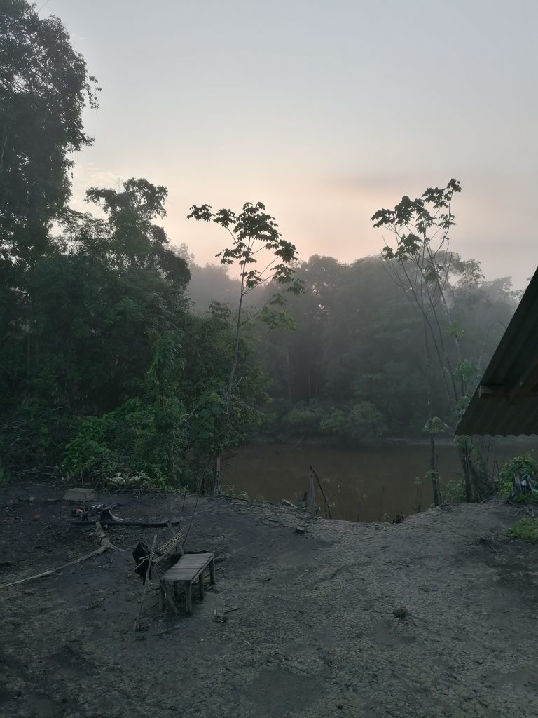 Ich stelle fest, dass ich kein Bettdecke habe. Naja, denke ich, wird schon gehen, bin ja im Dschungel, da ist es warm… tja, heute nicht. Ich beginne schnell zu frieren und decke mich mit T-Shirt und Handtuch zu, die ich noch im Bett liegen hatte… hilft aber kaum. Wieder kriege ich kaum Schlaf ab, so langsam wird das unangenehm. Am Morgen – davor hatte Keagan schon gewarnt – tropft Wasser von dem Blechdach… durch das Moskitonetz in mein Gesicht. Das ist nicht schön, macht aber auch keinen Unterschied mehr, nur als es auf mein Handy tropft finde ich es uncool. Mein natürlicher Rhythmus macht mich um 6 Uhr ganz wach und ich beschließe, aufzustehen und zu schreiben. Gute Entscheidung. Für eine halbe Stunde habe ich den vorderen Bereich für mich und kann einen wundervollen Morgen genießen, sogar mit ein bisschen Sonnenaufgangsorange über dem dampfigen Nebel, der vom Fluss aufsteigt. Die Vögel zwitschern, die Grillen zirpen… es ist die pure Entspannung, direkt neben der Natur zu leben.
