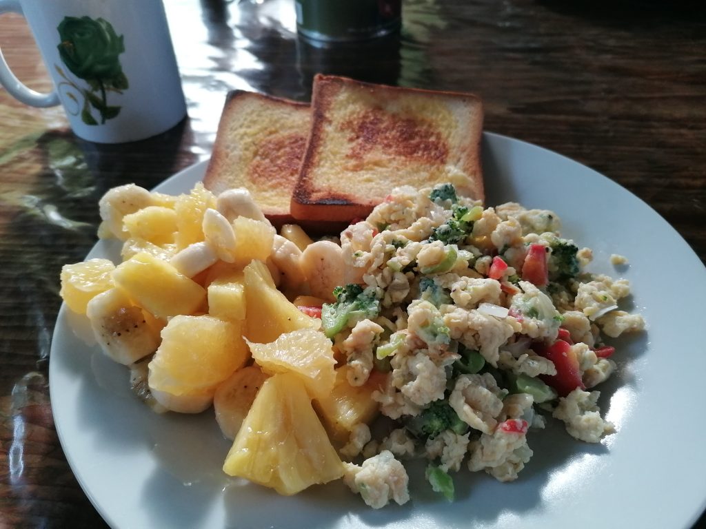 Nach und nach kommen die anderen und halten mich vom Schreiben ab, dann gibt es leckeres Frühstück mit Rührei und Gemüse, frischem Obst (Banane,Ananas,Orange) und gebratenem Toast.