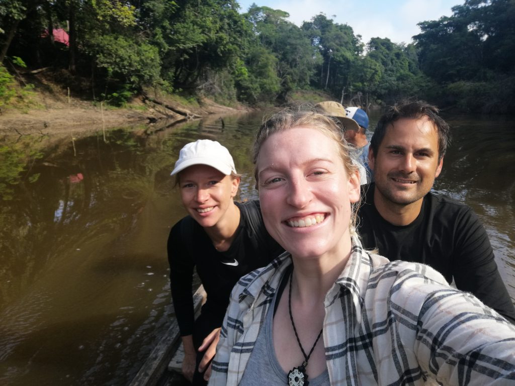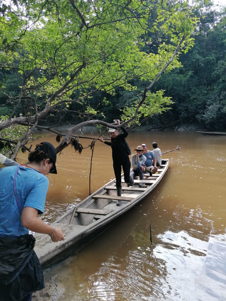 Wir fahren alle mit einem Boot los, das diesmal wirklich nicht mehr als eine Nussschale ist. Bootrand und Wasseroberfläche trennen keine zehn Zentimeter und es ist sehr wackelig. Aber sobald der Motor uns hinten anschiebt, geht’s ganz gut. Wir fahren über den Fluss, die Sonne scheint und alle beobachten die Umgebung mit den Vögeln, den Schmetterlingen und den riesigen Bäumen, auf denen selbst auch wieder Pflanzen wachsen.