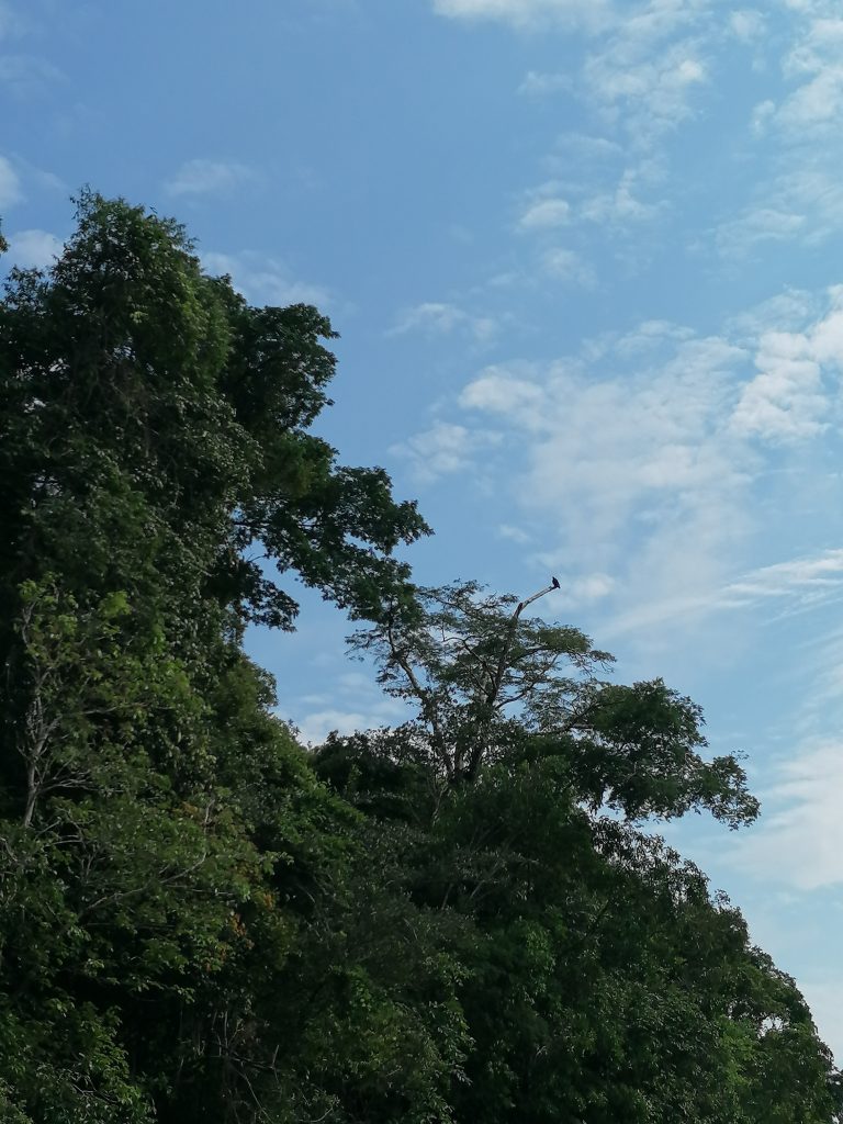 Maurice spricht gerade davon, dass er gerne Papageien sehen würde, da fliegen doch tatsächlich drei über uns hinweg. Viel zu hoch und zu schnell, um Fotos zu machen, aber es ist trotzdem großartig. Wir animieren Maurice über einen Jaguar zu sprechen, das klappt leider nicht.