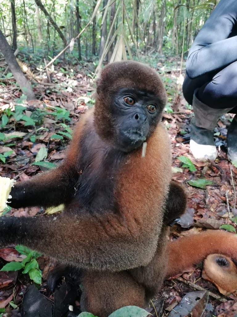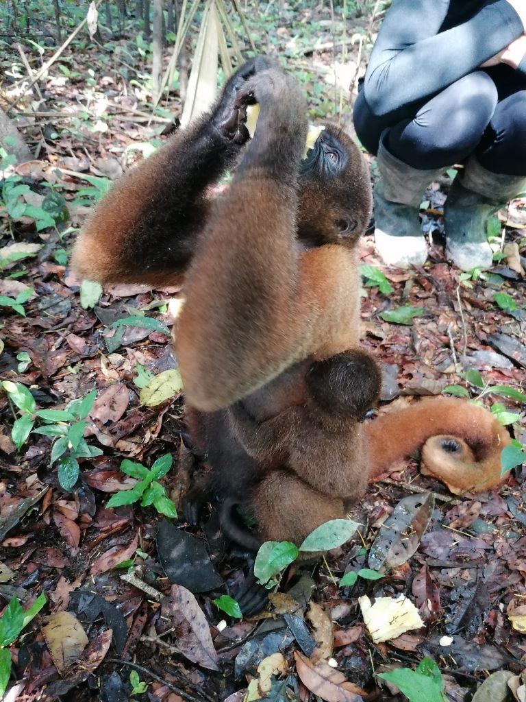Das Boot setzt uns ein Stück entfernt ab, dann geht es wieder rein in den Wald. Adriano hat diesmal Früchte mitgebracht und wir nähern uns wieder der Stelle, an der wir gestern die Affen getroffen haben. Und tatsächlich, schon bald deutet er nach oben und wir sehen unsere Freunde wieder. Maurice hält ein Stück Orange hoch und schon kommen sie nach unten geklettert und nehmen ihm das Stück aus der Hand.