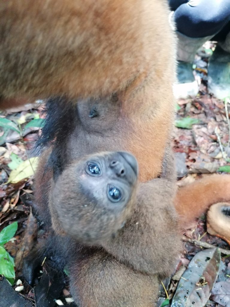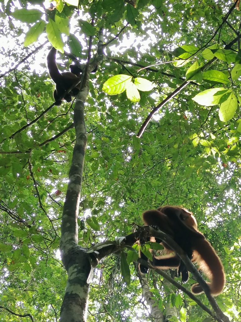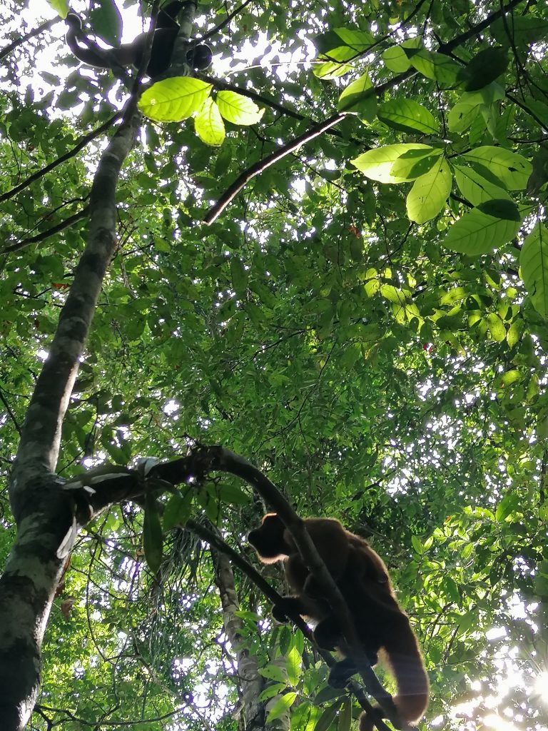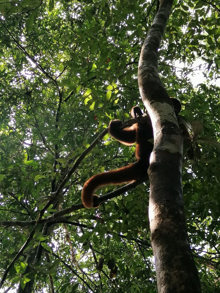 Adriano meint, dass es okay ist sie zu berühren, sodass ihr ein bisschen über die Schulter streiche… sie zuckt nicht zurück, ihr Fell ist ganz weich. Aber nur kurz, ich will sie nicht zu lange stören. Die Affen fressen ganz in Ruhe mit uns und steigen dann wieder in die Bäume. Adriano erklärt, sie füttern jetzt nur noch Orangen. Früher haben sie sie auch mit anderen Früchten, Brot oder Gebäck gefüttert, aber das hat den Tieren aufgrund des hohen Zucker- und Chemiegehalts nicht gut getan. Mit den Orangen helfen sie den kleinen Affengruppen, weil es nicht so viele gibt und ihnen die Vitamine gut tun. Wir sind verzaubert von der schönen Begegnung und gehen weiter in den Wald.