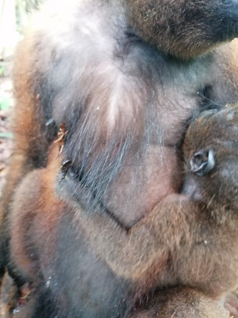Es handelt sich um ein Männchen und drei Weibchen, eine davon hat ein Baby. Ihr darf ich etwas geben. Sie kommt her, holt sich das Stück, setzt sich neben mich und frisst. Das kleine Baby klammert sich dabei fest an ihre Brust… es ist so schön zu beobachten. Ihre braunen Augen sind so… menschlich:
