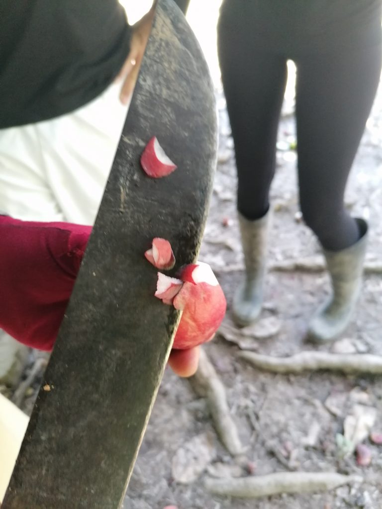 In einem kleinen, stehenden Bach versucht Adriano Aale anzulocken, klappt leider nicht. Schade. Wir laufen weiter zu einem kleinen Hof, von dessen Baum er rote Früchte pflückt, die ein bisschen aussehen wie Äpfel. Einige schmecken sehr sauer, aber einige auch richtig schön süß und fruchtig.