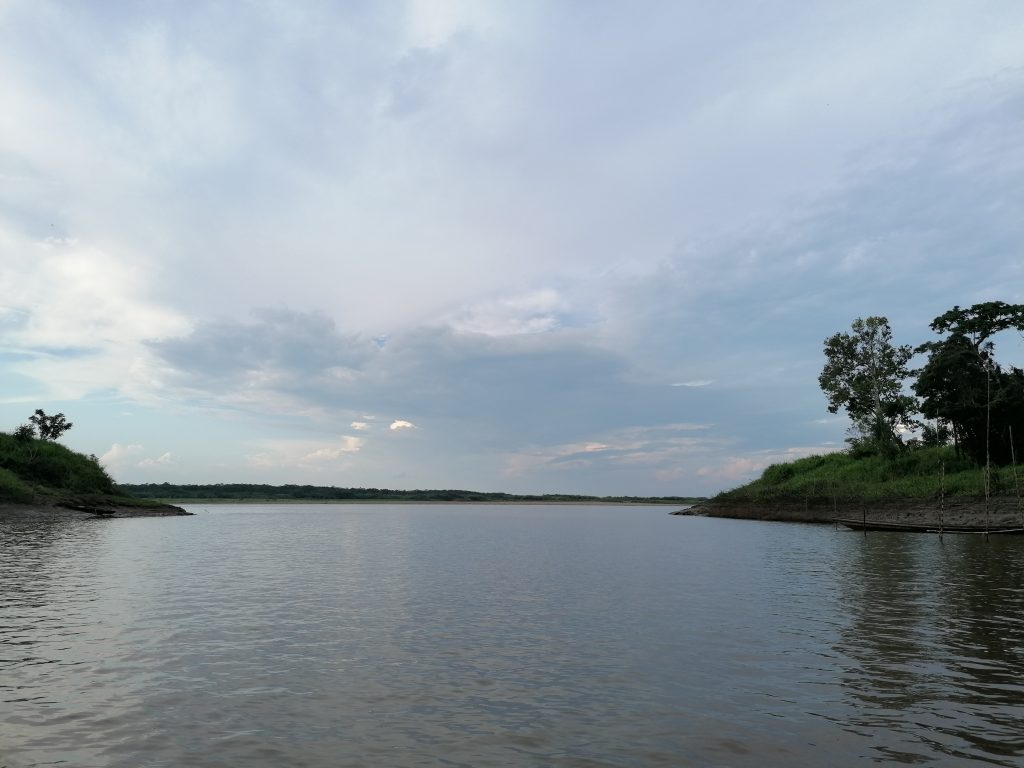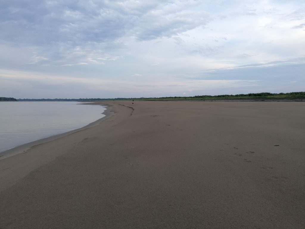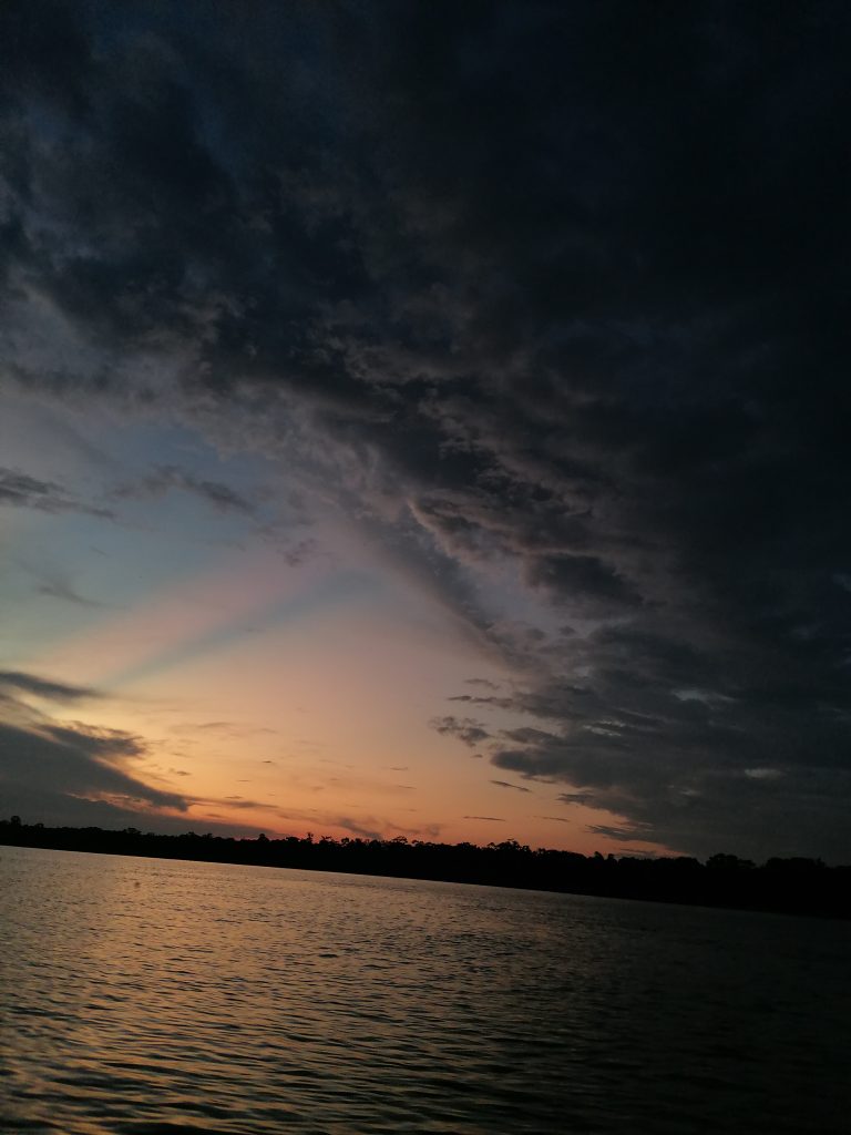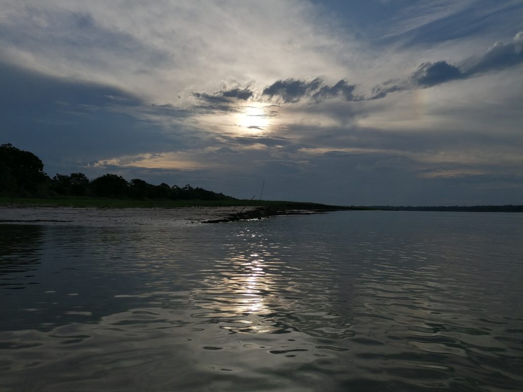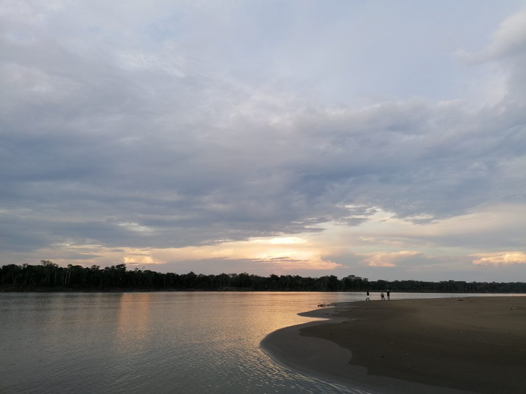 Naja, für den ersten Ausflug sind wir noch befreit, weil die beiden so besoffen waren, dass sie direkt eingeschlafen sind. Trotzdem finde ich es anfangs doof, dass wir jetzt mehr Leute sind. Wir drei waren eine schöne kleine Gruppe. Aber schon bald stellt sich heraus, dass es mit Reem und Jonas super funktioniert, also alles gut. Heute fahren wir mit dem Boot raus aus unserem kleinen Nebenarm zurück auf den Ucayali Fluss, um dort den Sonnenuntergang anzuschauen. Auf der Kreuzung sehen wir wieder ein paar Flussdelfine, aber natürlich wieder kein gutes Foto, die sind einfach zu schnell. Das Boot setzt uns auf dem Strand ab, von dort sehen wir die Sonne sinken. Trotz der vielen Wolken ist das Spektakel wunderschön. Die Vögel fliegen über uns hinweg, große Weiße, kleine Schwarze, und um uns herum immer der Wald. Das Klima ist perfekt, ein sanfte Brise weht uns um die Nase, aber es ist angenehm warm. Nicht mal die Moskitos stechen uns zu Tode, es ist ein perfekter Abend.