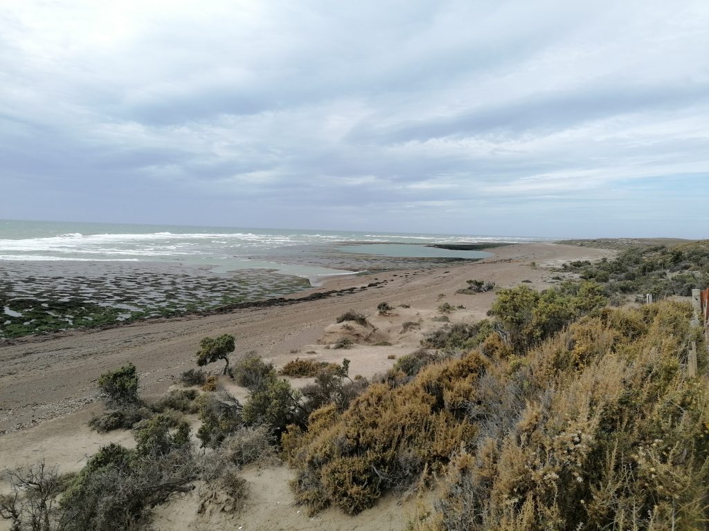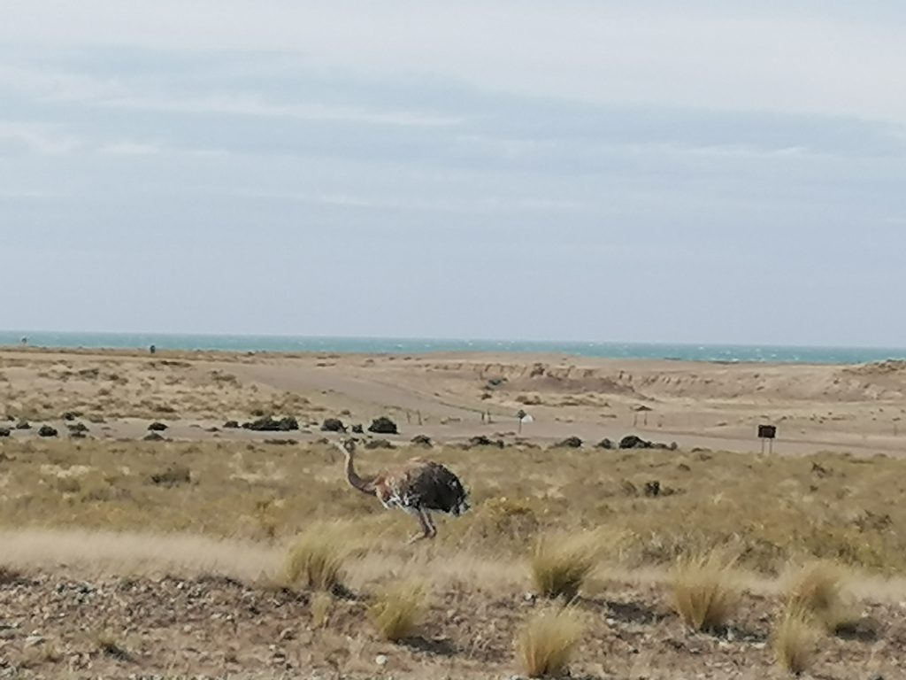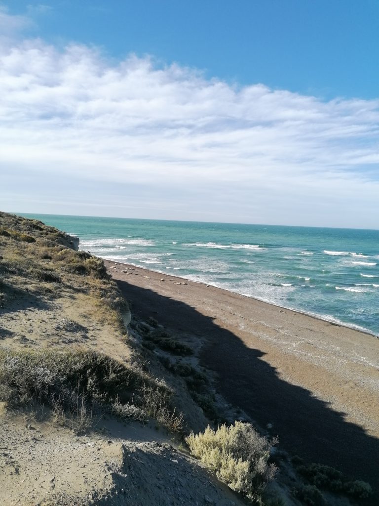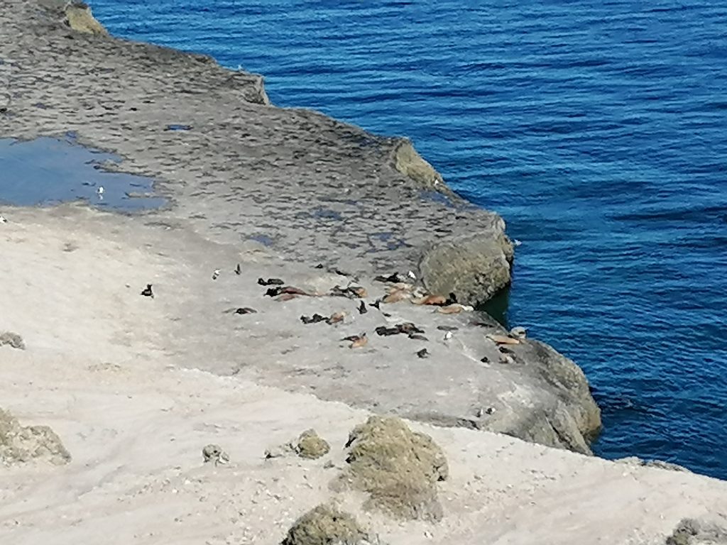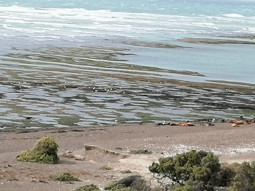 Wir fahren über eine lange, ebene, immer gleiche Dreckstraße… Pampa halt. Die Fahrt dauert fast eine Stunde, 70 km bis zum anderen Ende der Insel. Der Punkt ist im Moment das Highlight für die Touristen: Es ist nämlich Orca-Zeit. Und mit ein bisschen Glück kann man hier – und zwar nur hier, weltweit – mit bloßem Auge die Orcas jagen sehen. Die Bedingungen sind optimal, flache Buchten und eine große Robbenkolonie ganz in der Nähe. Dafür harren einige Touristen stundenlang an dem windigen Aussichtspunkt aus, oft sogar mehrere Tage hintereinander… doch die Wahrscheinlichkeit, das tatsächlich zu beobachten ist relativ gering. Wir sehen keine… wir bleiben aber auch nicht lang. Keiner von uns hat Lust, sich in den Wind zu stellen. Die Landschaft ist wunderschön und auch die Robben sind schön zu beobachten. Danach fahren wir weiter zum nächsten Ziel.