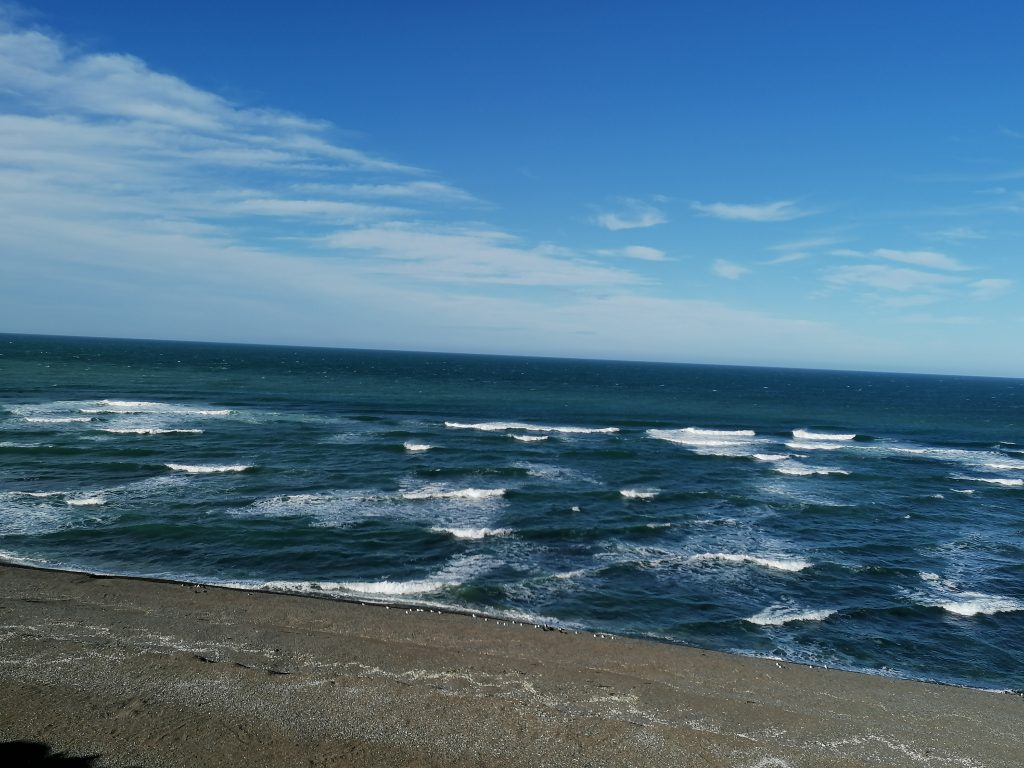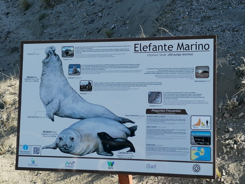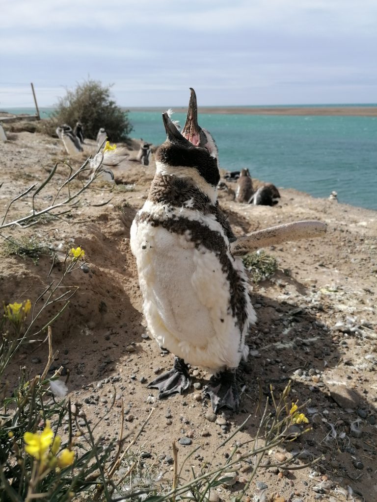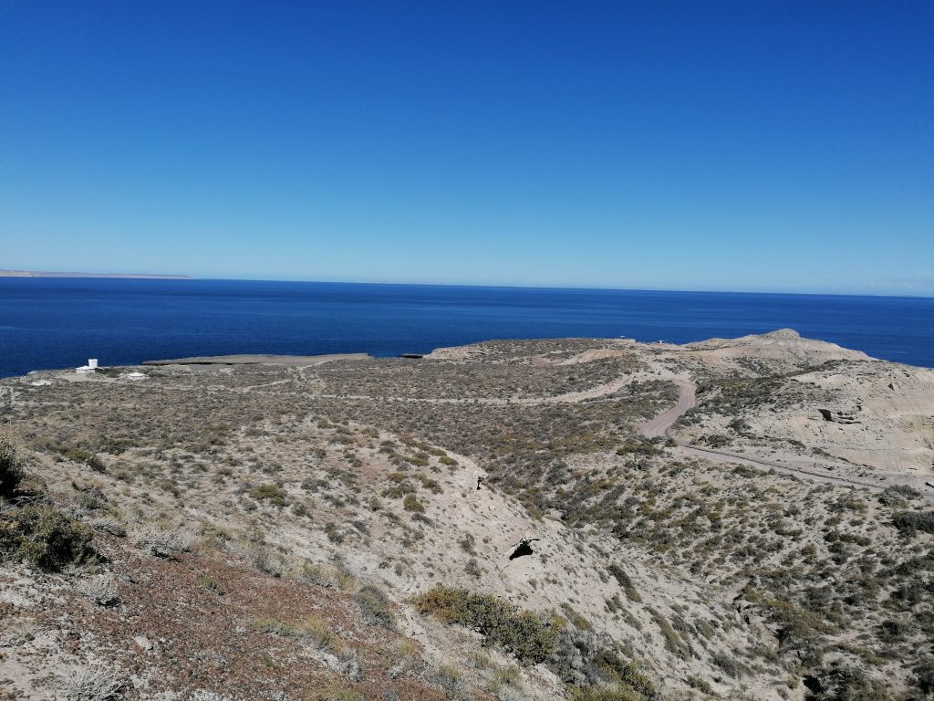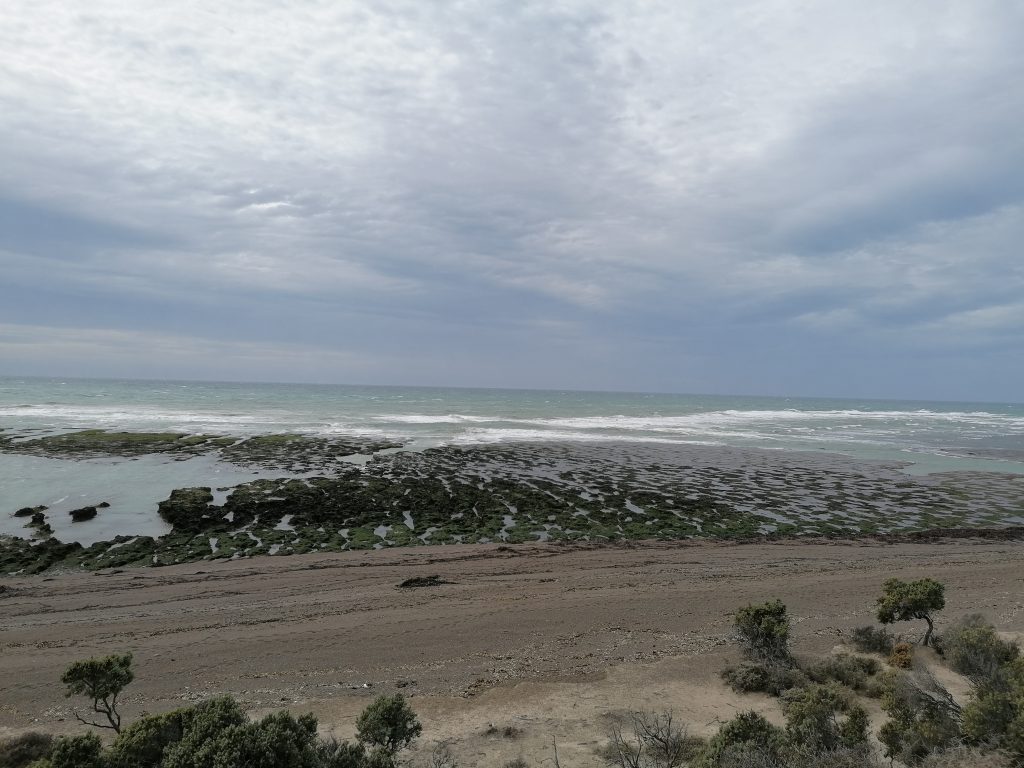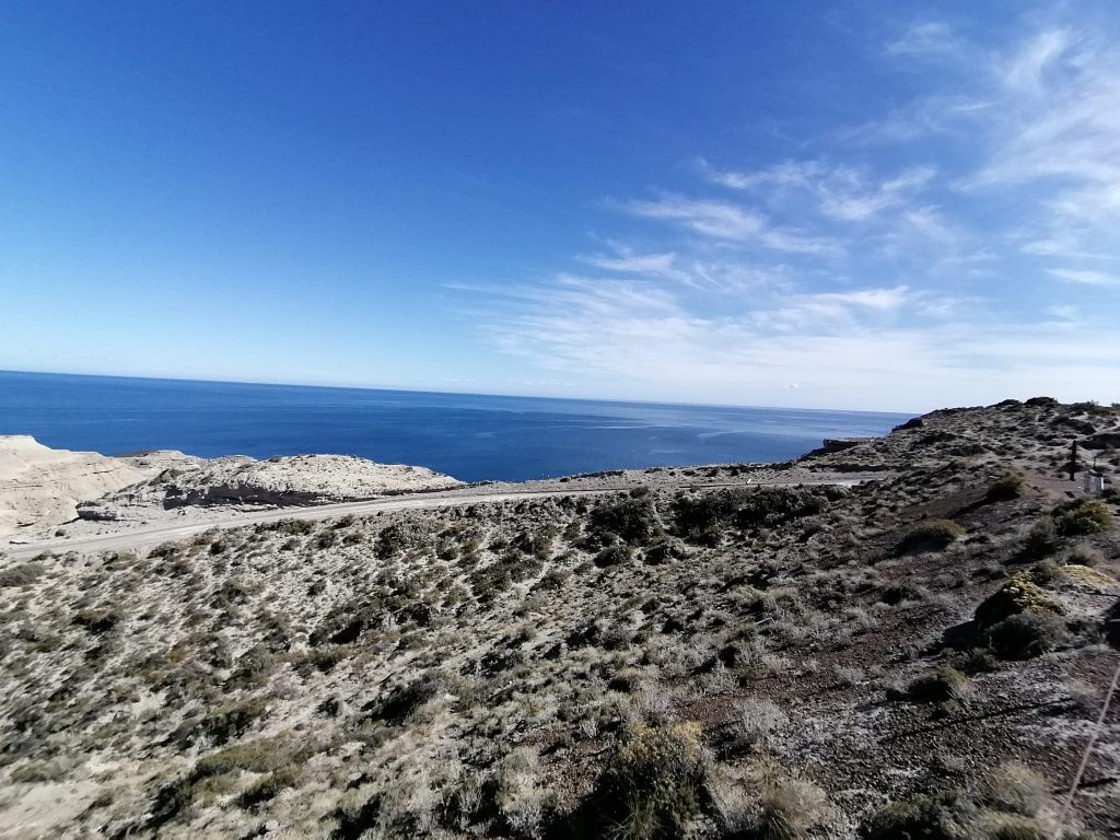 Wir fahren über eine lange, ebene, immer gleiche Dreckstraße… Pampa halt. Die Fahrt dauert fast eine Stunde, 70 km bis zum anderen Ende der Insel. Der Punkt ist im Moment das Highlight für die Touristen: Es ist nämlich Orca-Zeit. Und mit ein bisschen Glück kann man hier – und zwar nur hier, weltweit – mit bloßem Auge die Orcas jagen sehen. Die Bedingungen sind optimal, flache Buchten und eine große Robbenkolonie ganz in der Nähe. Dafür harren einige Touristen stundenlang an dem windigen Aussichtspunkt aus, oft sogar mehrere Tage hintereinander… doch die Wahrscheinlichkeit, das tatsächlich zu beobachten ist relativ gering. Wir sehen keine… wir bleiben aber auch nicht lang. Keiner von uns hat Lust, sich in den Wind zu stellen. Die Landschaft ist wunderschön und auch die Robben sind schön zu beobachten. Danach fahren wir weiter zum nächsten Ziel.