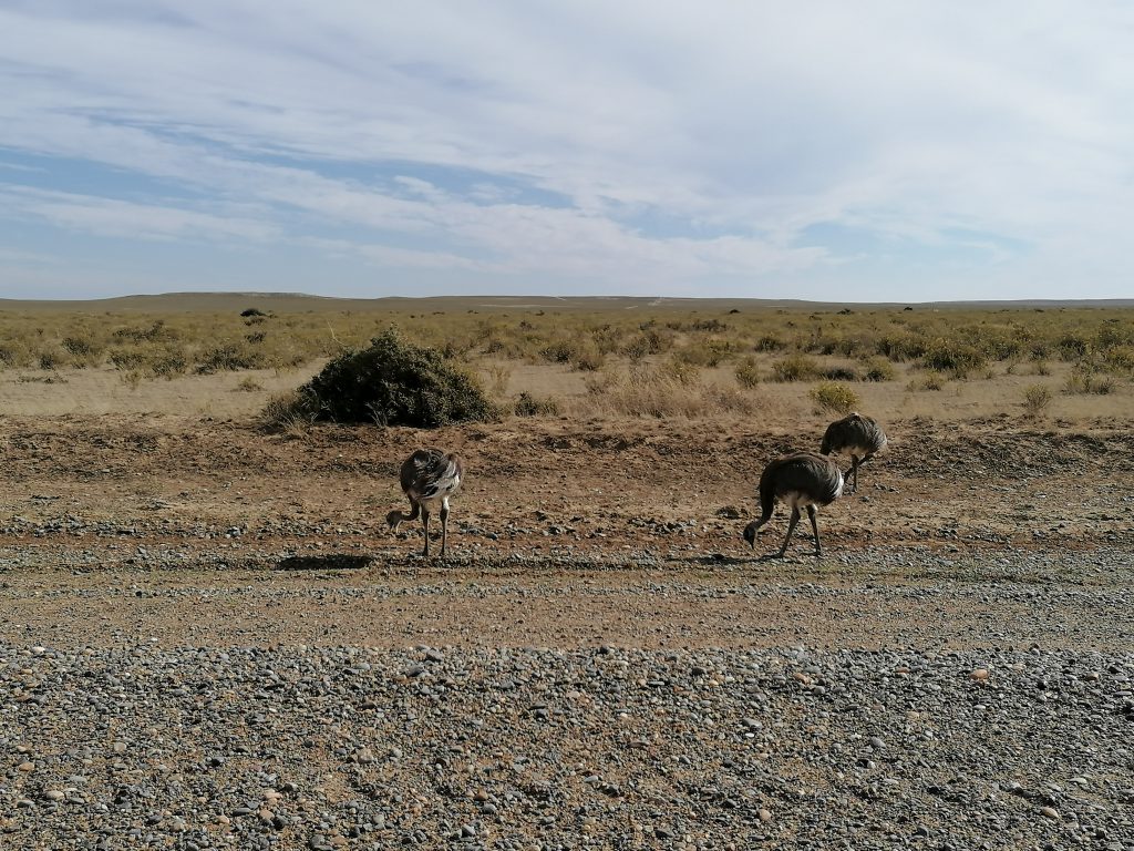 Auf dem Weg dahin halten wir bereits ein paar Mal, um Fotos von den Choiques (kleinere Nandus, selbe Familie) zu machen, die hier sehr nahe an der Straße vorbeikommen. Peter ist, genau wie ich, immer ganz begeistert, wenn er die Chance auf ein gutes Foto hat. Sobald sie anfangen zu rennen, wackelt das Gefieder im Wind hin und her, was sehr lustig aussieht. Puschelpopo pur!!