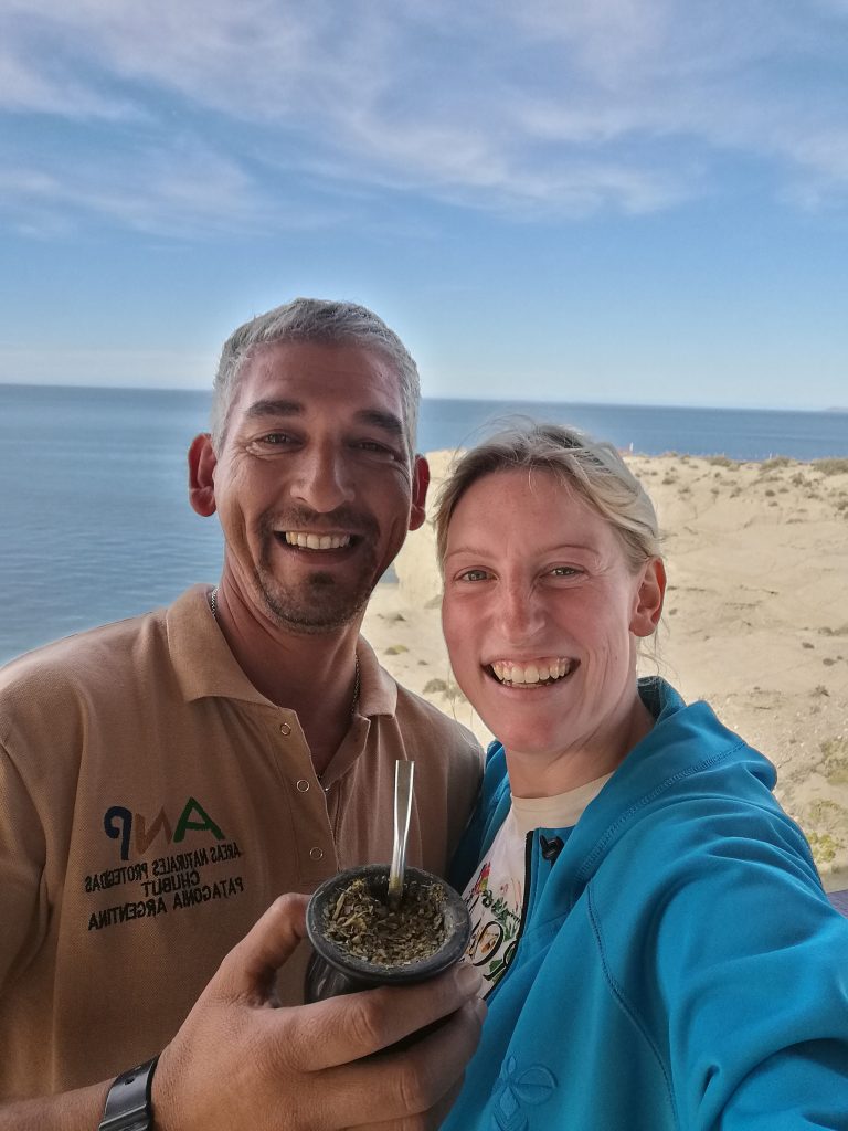 Sergio ist ein Original für sich und gibt eine Lebensweisheit nach der nächsten von sich. Ich kann nicht anders als ihm recht zu geben. Hier auf der Insel ist es wie in Hollywood. Nur, dass die Tiere die Stars sind und die Touristen die Paparazzis. Ich denke an meine Pinguinefotos und fühle mich ein bisschen schlecht. Während wir trinken, erkläre ich, dass ich überlegt habe, mir auch einen Mate zu kaufen, aber ich hab nicht so viel Platz in meinen zwei Rucksäcken. Sergio sieht mich schief an. Du fährst doch jetzt nach Patagonien, oder? – Ja? – Na, jetzt stell dir mal vor, du sitzt in den Bergen an einem wunderschönen, türkisblauen See, hast einen langen Aufstieg hinter dir und darfst jetzt zur Belohnung das schöne Panorama genießen. Na und, was machst du jetzt? – Ich seufze und nicke – Mate trinken, natürlich. Und genießen – Na, also, da hast du’s doch. – Ich nicke. Er hat schon wieder recht.