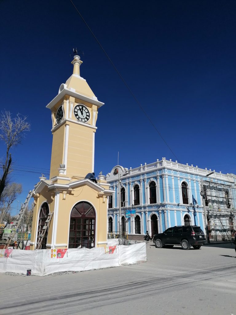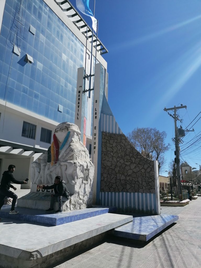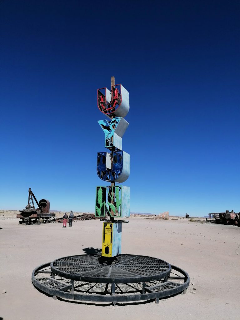 die letzten Meter in Chile verschlafe ich fast komplett. Wir kommen erst gegen halb acht an der bolivianischen Grenze an. Der Grenzübergang verläuft relativ reibungslos und kurz danach habe ich einen neuen Stempel in meinem Reisepass… und insgesamt 10 chilenische Stempel. Der Bus fährt weiter. Landschaftlich ändert sich erstmal nicht viel, wir bleiben im Wüstenklima und ziemlich hoch. Gegen Mittag erreichen wir dann Uyuni. Es ist meine erste Stadt in Bolivien und der Unterschied ist deutlich zu sehen. Die Straßen sind deutlich schlechter, viel mehr Sand, noch weniger Teer. Je näher wir ans Zentrum kommen, desto bunter und chaotischer geht es zu.