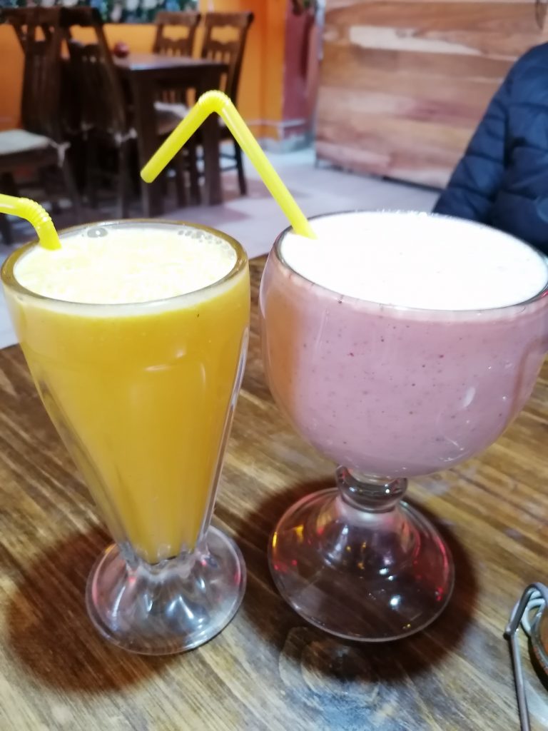 Als wir rausgehen, sind wir erleichtert. Wir hatten befürchtet, nicht gleich loszukönnen, weil wir so knapp dran sind, aber das scheint gar kein Problem zu sein. Ins Hotel wollen wir nicht zurück, also gehen wir in ein Restaurant neben an. Da ist es etwas wärmer und Hunger haben wir auch. Es dauert ewig, bis überhaupt mal jemand auftaucht und das Mädel sieht aus, als hätte sie einen Schlafanzug an. Auch die anderen Gäste sind überrascht, dass es offenbar so lange dauert. Aber okay, wir haben es ja nicht eilig. Wir bestellen und auch dann dauert es ewig, bis das Essen kommt… aber schmecken tut es ausgezeichnet. Richtig frisch und lecker. Auch die Milchshakes sind ein Traum und vor allem riesig… der Preis dafür ist ein Witz. Kaum 12 Euro für eine volle Mahlzeit mit Getränk.