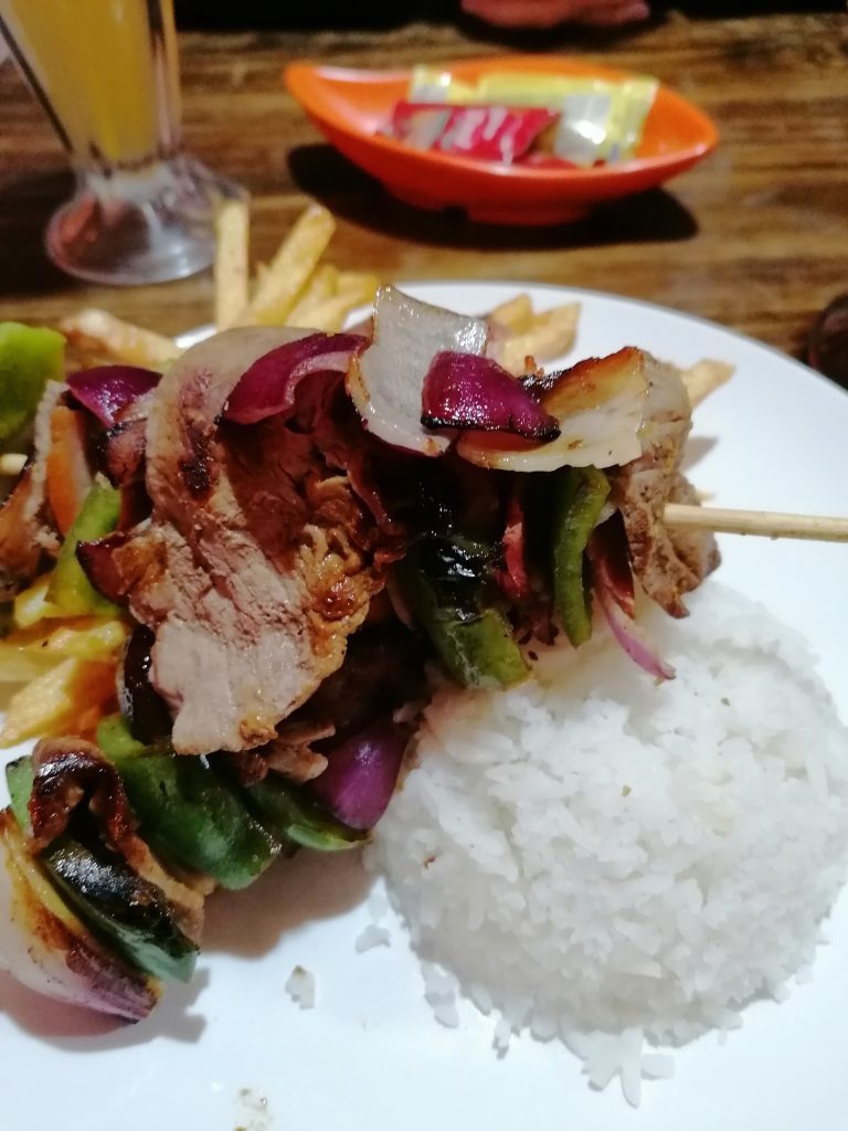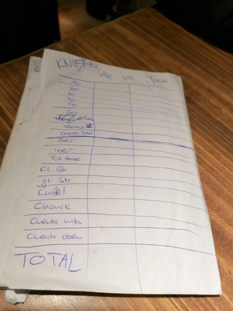 Danach suchen wir uns ein Café und finden das vegane Llama-Café (Lama schreibt man eigentlich korrekt Spanisch mit Ll und spricht es J). Da ist es schön kuschelig warm… und komplett voll mit Europäern, kein einziger Einheimischer. Wen wundert’s? Wir setzen uns, bestellen Tee und entdecken, dass es Würfel gibt. Kurzentschlossen hol ich meinen Notizblock raus, zeichne Kniffel auf und so vertreiben wir uns auf eine echt schöne Art die Zeit.