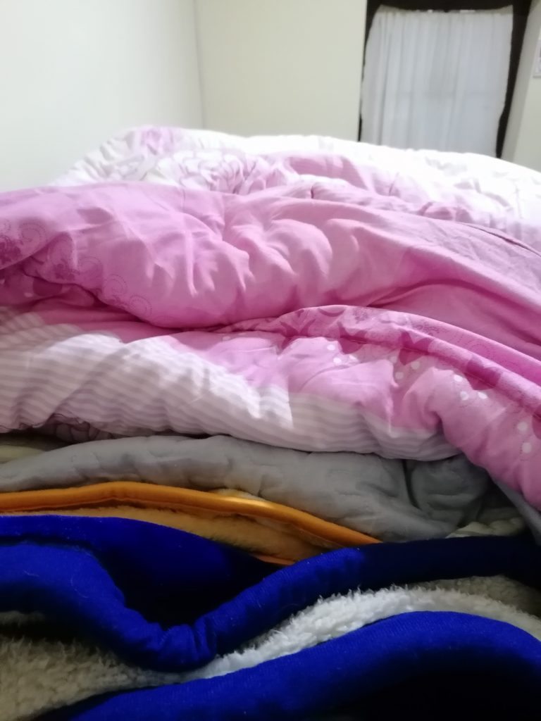 Es sieht ganz nett aus, recht rustikal, schöner Innenhof und hohe Wände. Der Rezeptionist ist allerdings eine Vollkatastrophe. Erst kommt er ewig nicht, dann hat er ständig die Kopfhörer in den Ohren und gefühlt weiß er nicht mal, auf welchem Planeten er ist. Aber er bringt uns zu unseren Zimmern, wo wir auspacken. Ich würde mich gerne hinlegen und ausruhen… aber es ist so kalt in dem Raum, dass man es kaum aushält. Selbst unter den fünf Decken ist es eisig, weil das Bett selbst so ausgekühlt ist, dass es ewig dauert, bis ich es aufgewärmt hätte. Heizung gibt es nicht. In ganz Bolivien wird es schwer, eine Heizung zu finden, egal wie kalt es ist. Ehrlicherweise verstehe ich nicht so ganz warum, aber das Land ist eben sehr arm und Heizungen/Leitungen sind teuer.