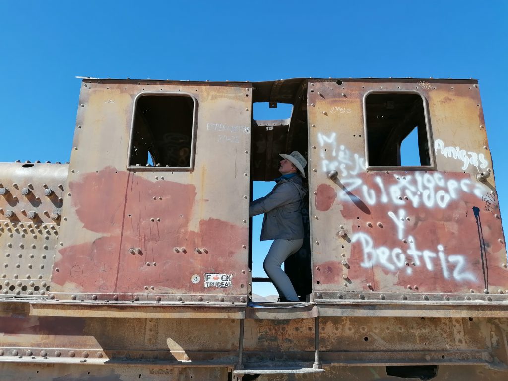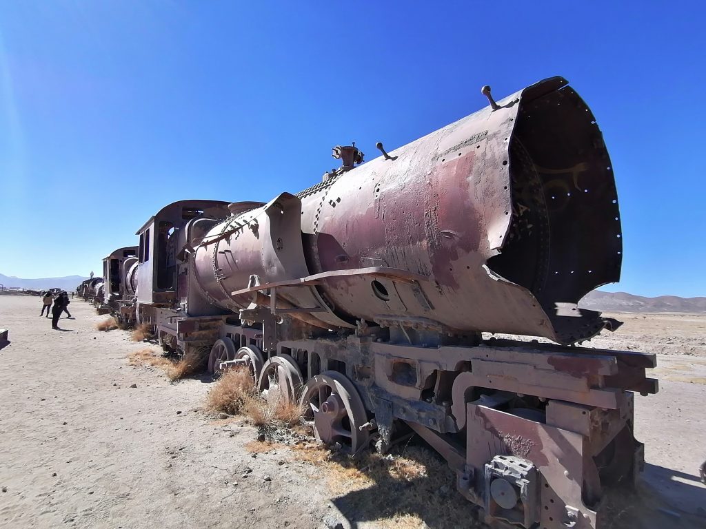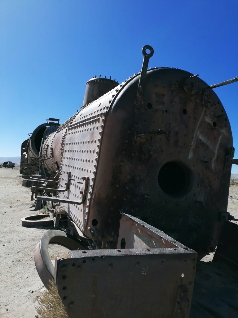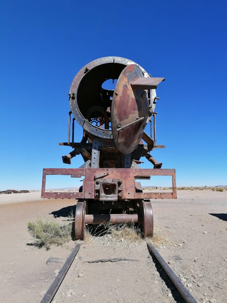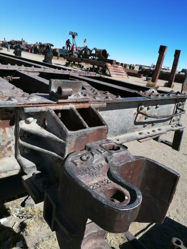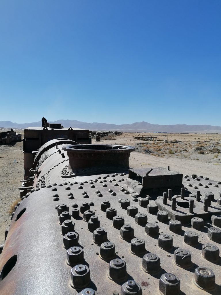 Der erste Stopp ist nur knapp außerhalb der Stadt: Der Eisenbahnfriedhof. Auf einem großen Areal im Sand stehen verlassen, verrostet und ausgeschlachtet riesige alte Dampflokomotiven, sowie Güterzuganhänger. Überall laufen die Touristen herum, klettern auf den Zügen herum machen Fotos, spazieren zwischen dem alten Stahl. Es sind die alten Züge, die Mineralien aus den Anden nach Chile transportiert haben, um im dortigen Hafen verschifft zu werden. Die Züge wurden aus den USA importiert, mit dem Schiff hierher verfrachtet … jetzt fährt auf der Strecke nur noch ein Zug, einmal täglich, der Rest verrostet hier seit 1960. Eigentlich eine Verschwendung, den Stahl hätte man sicher auch gut verwenden können. Aber gut, als Touristenattraktion macht es schon was her.