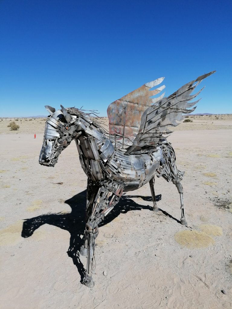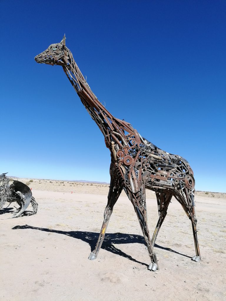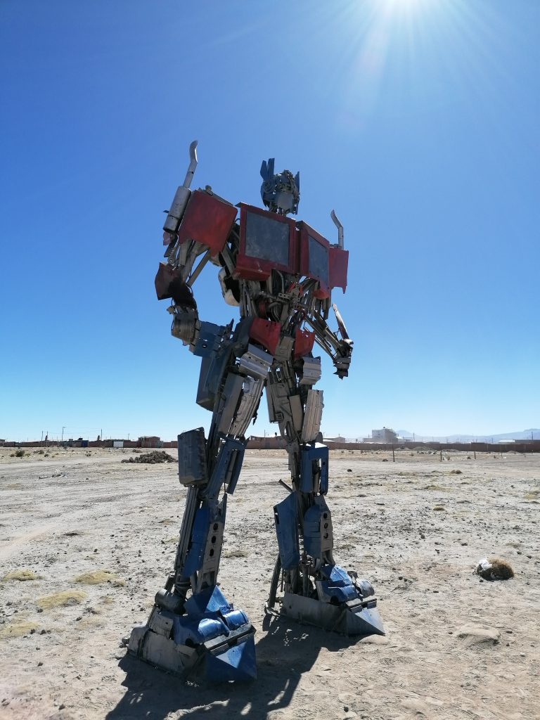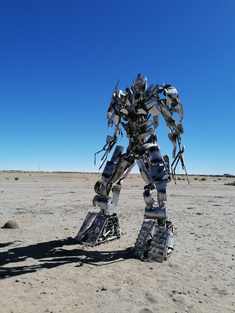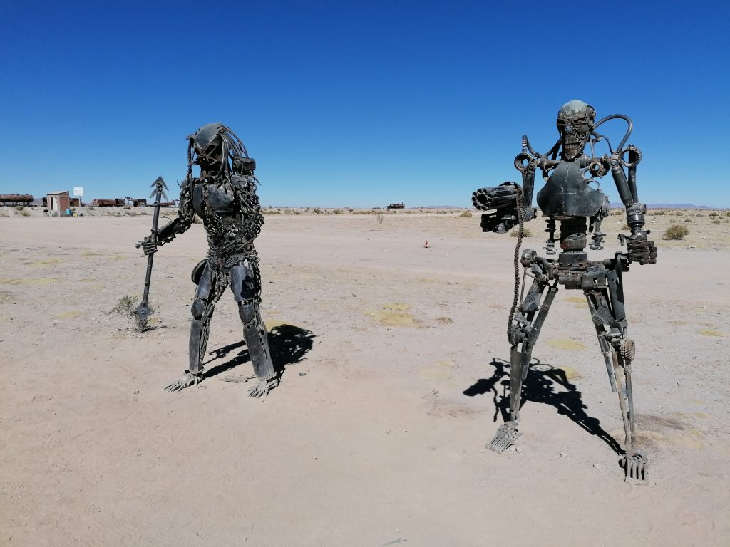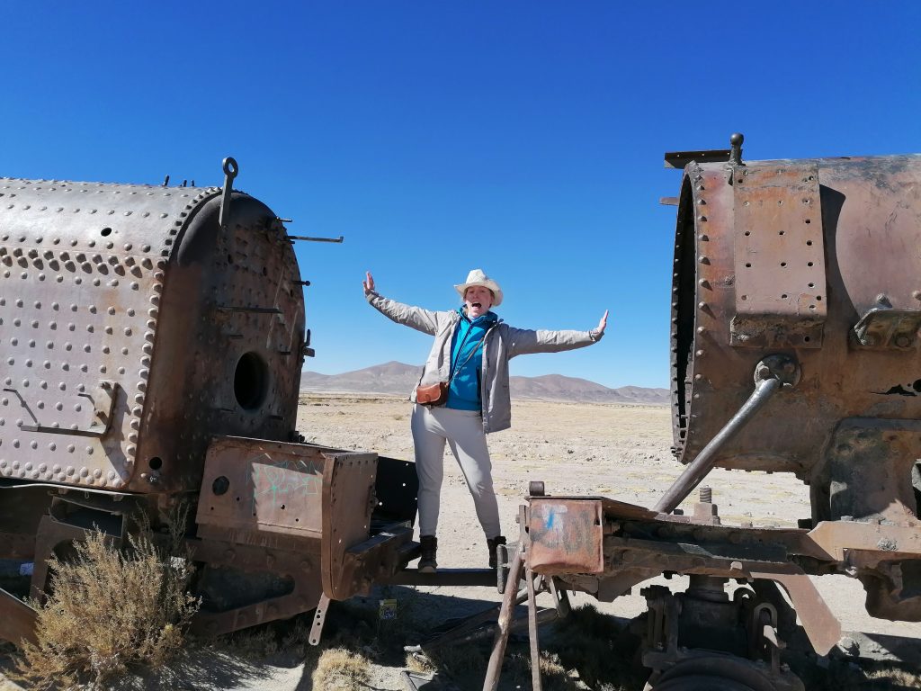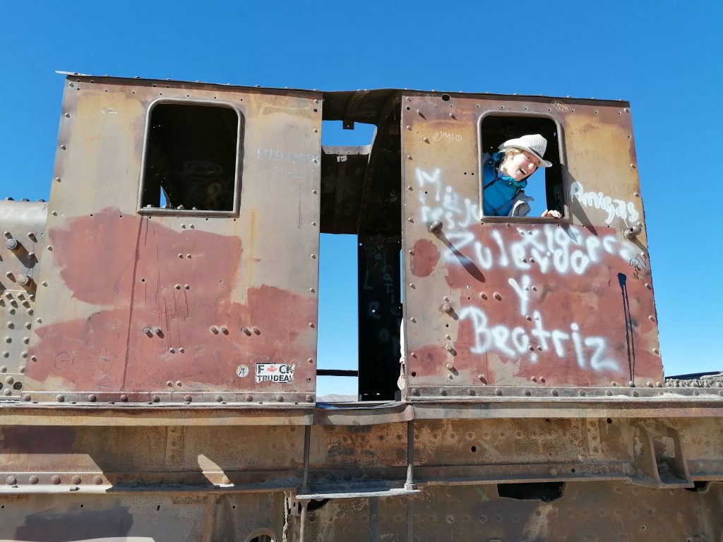 Der erste Stopp ist nur knapp außerhalb der Stadt: Der Eisenbahnfriedhof. Auf einem großen Areal im Sand stehen verlassen, verrostet und ausgeschlachtet riesige alte Dampflokomotiven, sowie Güterzuganhänger. Überall laufen die Touristen herum, klettern auf den Zügen herum machen Fotos, spazieren zwischen dem alten Stahl. Es sind die alten Züge, die Mineralien aus den Anden nach Chile transportiert haben, um im dortigen Hafen verschifft zu werden. Die Züge wurden aus den USA importiert, mit dem Schiff hierher verfrachtet … jetzt fährt auf der Strecke nur noch ein Zug, einmal täglich, der Rest verrostet hier seit 1960. Eigentlich eine Verschwendung, den Stahl hätte man sicher auch gut verwenden können. Aber gut, als Touristenattraktion macht es schon was her.