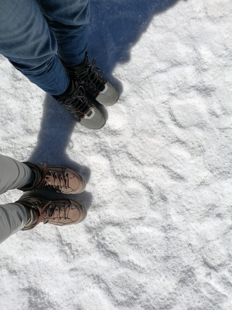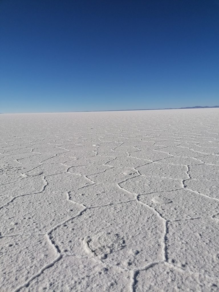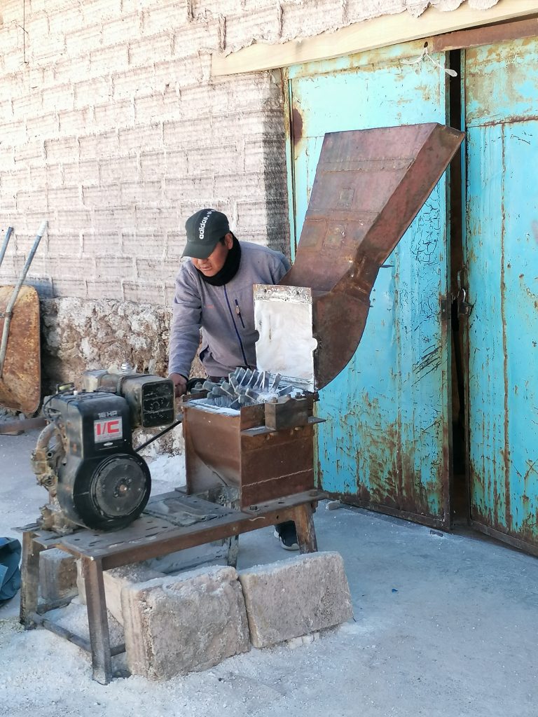 Im Salzwerk erfahren wir, dass die Salzwüste von Uyuni eigentlich Salzwüste von Colchani heißen müsste, da das der nächste Ort ist und auch der, der mit dem Salz arbeitet. Insgesamt hat sie eine Fläche von 12 Quadratkilometern und selbst das Trinkwasser hier ist leicht salzig.Das Salz aus der Wüste wird nur als Speisesalz verwendet und in kleine Beuteln abgepackt. Die Manufaktur hier entnimmt nur auf wenigen Flächen Salz, dann wechseln sie den Standort… und das Salz wächst nach. Ich werde stutzig. Nachwachsendes Salz? Der Guide nickt, wenn sie zu der Stelle, an der sie gearbeitet haben, drei Wochen später zurückkehren, ist das Salz wieder gekommen. Interessant… aber da ist doch was faul?! Ich frage mich, ob das vielleicht eine Zeit lang „nachwächst“, aber irgendwann ein gewisser Vorrat ausgeschöpft ist, wie bei Petroleum vorkommen… das kann mir niemand beantworten.