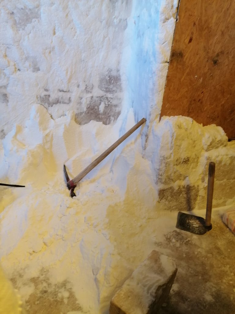 Dann bekommen wir eine kleine Führung durch die Salzmanufaktur. Schon draußen ist ein kleiner Salzhaufen, in dem alle mit den Schuhen scharren. Eine von den jungen Leuten im andern Auto legt sich hin und macht einen „Salzengel“ – Okay, wem’s gefällt.