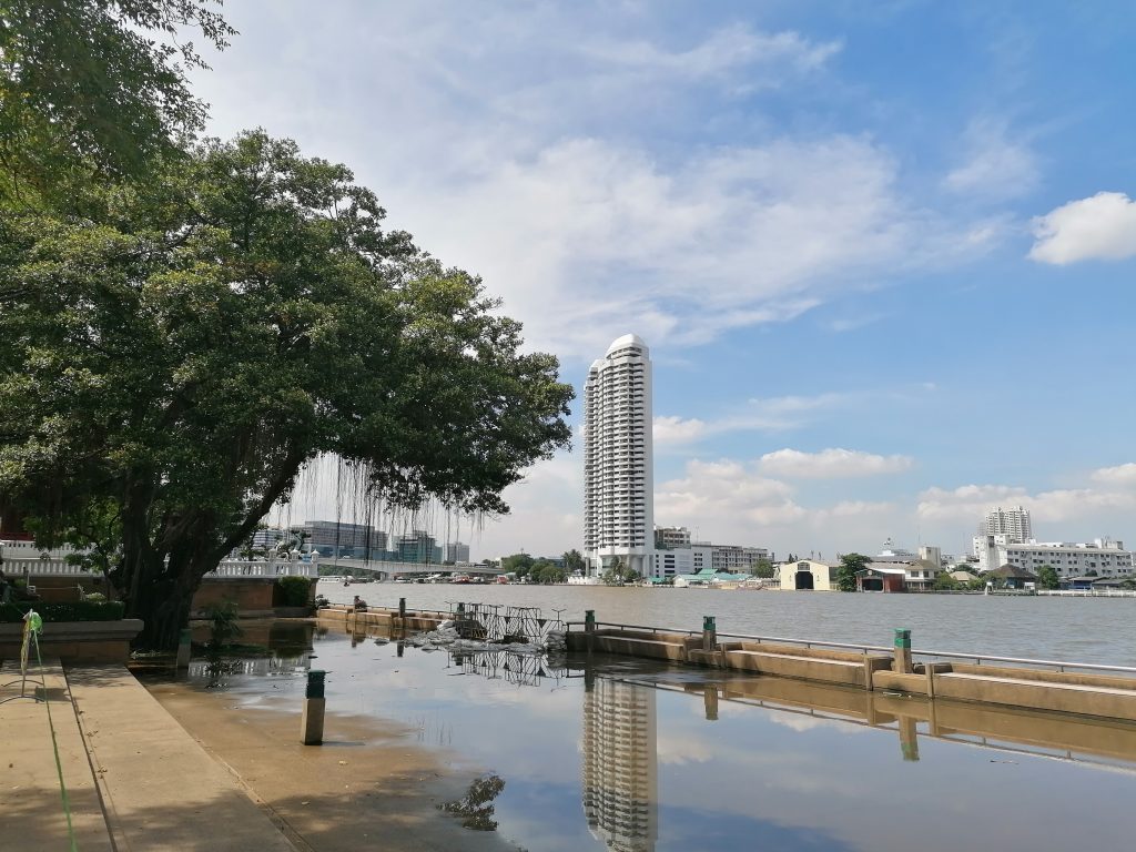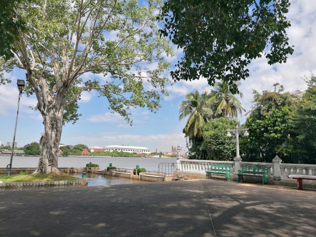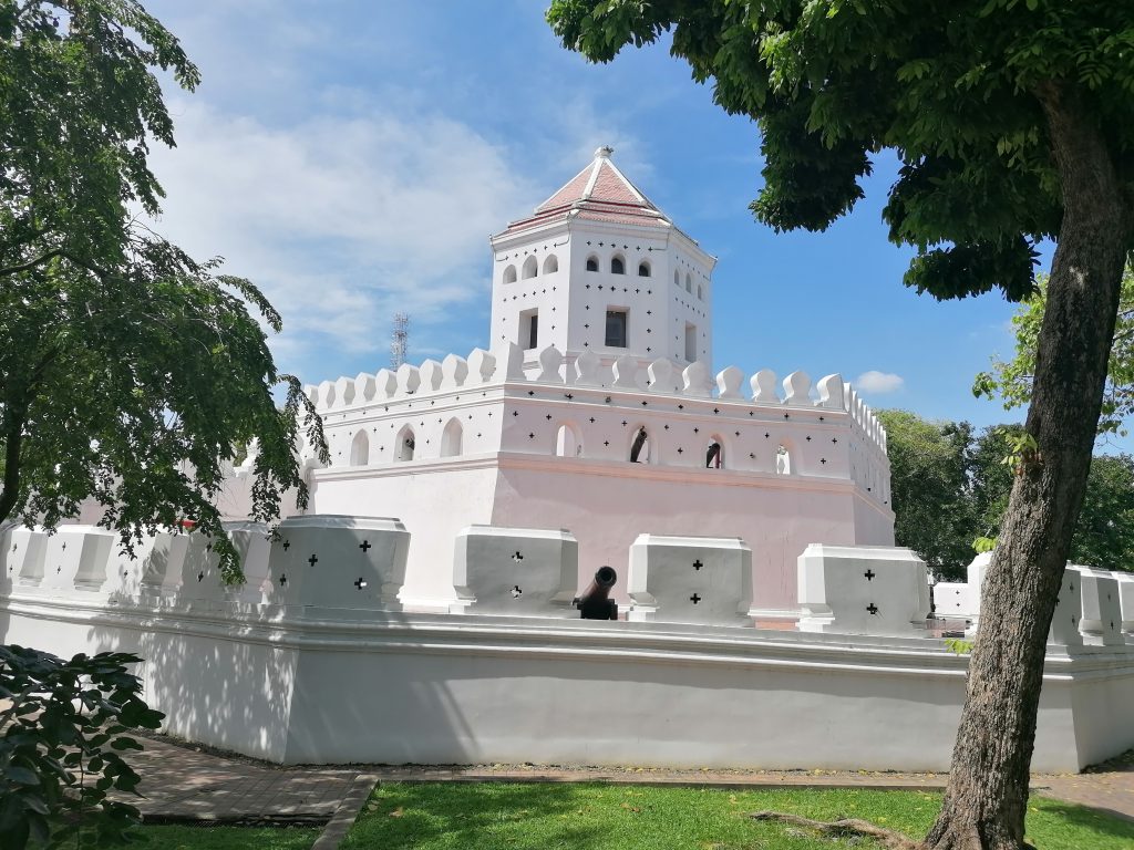 Ich sitze wieder beim Frühstück mit Pancakes und diesmal Kaffee und schaue auf den kleinen Fluss, der neben meinem Tisch fließt. Natürlich ist er recht schmutzig, man sieht nicht viel, aber man erkennt doch ganz deutlich, dass dort ein riesiger Fischschwarm sein muss, weil die dunklen Körper immer wieder die Oberfläche durchbrechen. Das beobachte ich eine Weile interessiert. Heute habe ich touristisch nicht viel zu tun, ich muss mir eher noch die Zeit vertreiben, bis ich am Nachmittag wieder in den Bus nach Süden steige. Nach dem Frühstück checke ich im Hostel aus und lasse meine Sachen bei den Katzen stehen. Dann schnappe ich mir meine nagelneue Gitarre und mache mich auf den Weg zu einem kleinen Park, den ich gestern entdeckt habe, nicht weit vom Hostel. Der liegt am Chao Phraya Fluss neben einer kleinen Festungsanlage Phra Sumen.