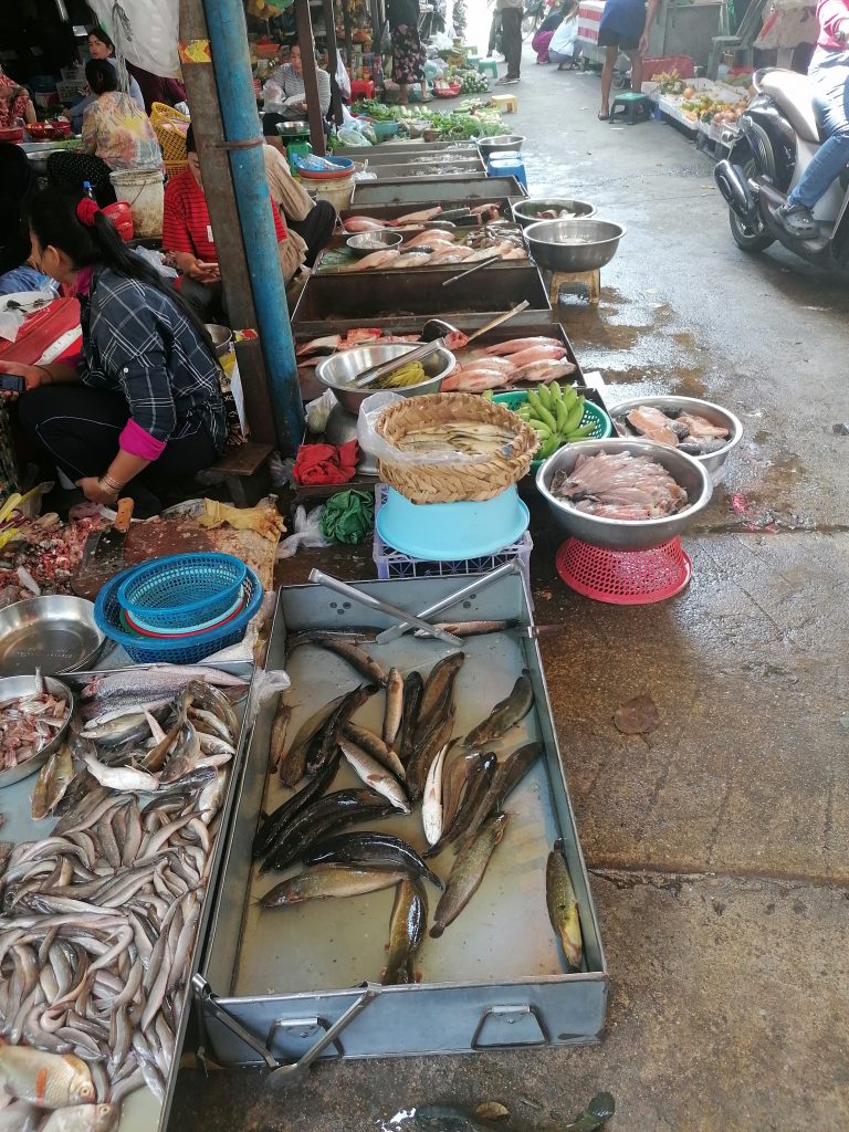 Zuvor komme ich zufällig an einer kleinen Marktstraße vorbei und beschließe, mir mal wieder das typische, bunte Treiben anzuschauen. Wie immer ist viel los, Es liegen Obst, Gemüse, Fleisch, Fisch alles auf dem Boden.