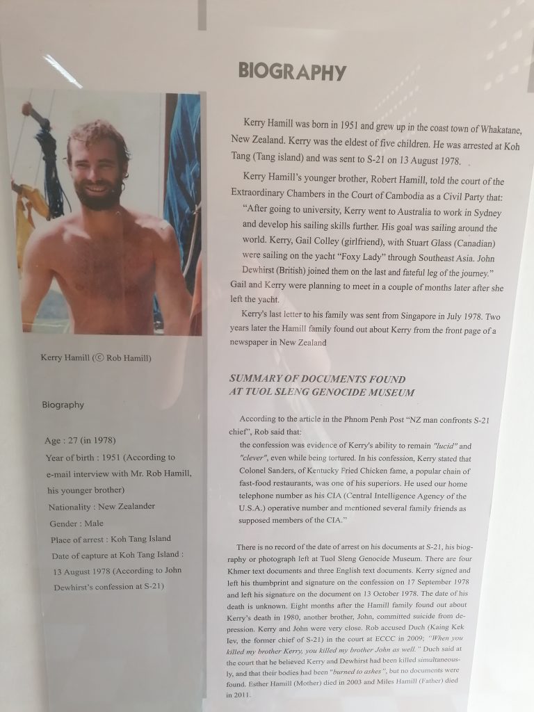 Vor allem eine Geschichte ist tragisch: Kerry Hamill, Neuseeländer, Ende 20 segelt zu dieser Zeit mit vier Freunden an der Küste Kambodschas… und wird von den Roten Khmern festgenommen. Seine Protokolle sind in den Akten, er hat versucht, Nachrichten zu senden, seine Folterer zu verwirren… sein genaues Todesdatum ist unbekannt, seine Leiche wurde wahrscheinlich verbrannt. Die Familie zerbricht an dem grauenhaften Schicksal. Ich kann nicht fassen, was ich lese! Weil es genauso gut jemand wie ich hätte sein können. Nichtsahnend auf Entdeckungsreise einem grausamen Regime in die Hände gefallen, dass die Brutalität besitzt einen international Reisenden einzusperren, zu foltern und zu ermorden.