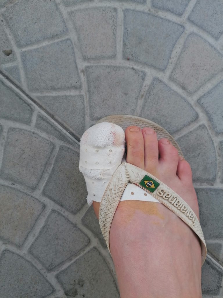 Zuerst beachte ich es nicht weiter, will es einfach bluten lassen und später auswaschen… aber innerhalb von Sekunden ist mein kompletter FlipFlop ein roter See und ich beschließe, dass ich das in einer fremden Bakterienumgebung lieber gut gesäubert und verbunden hätte.