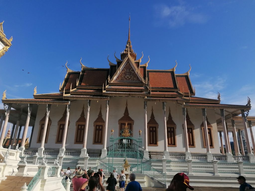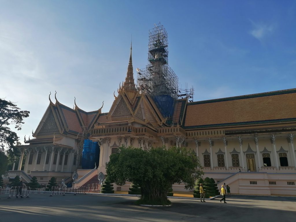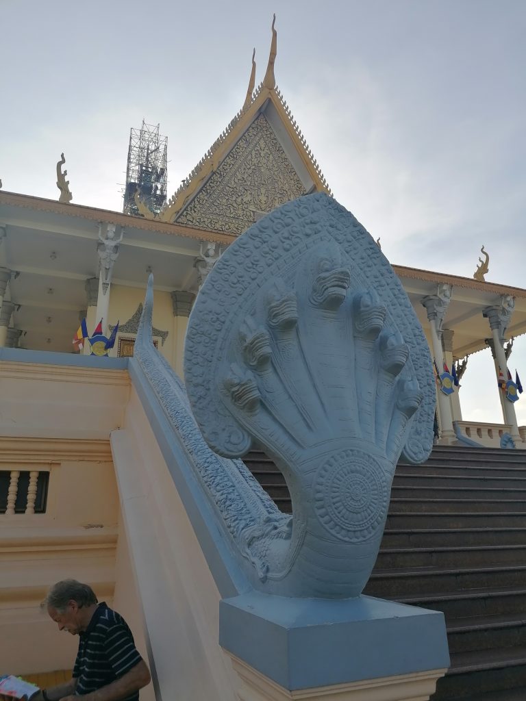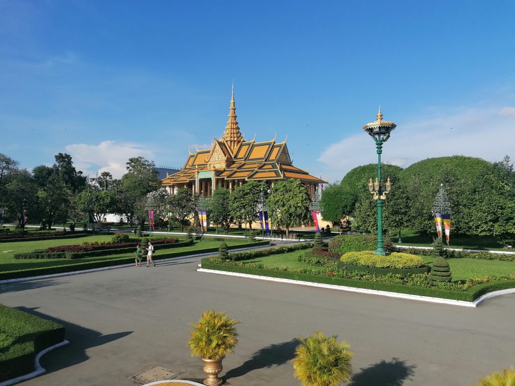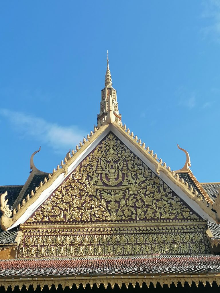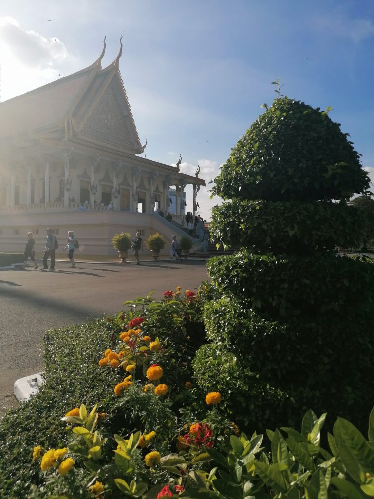 Die Palastanlage ist wunderschön. Der Garten ist perfekt frisiert, mit exotischen Blumen tollen Skulpturen verziert. Die verschiedenen Gebäude sind fabelhaft. In Vietnam habe ich die Architektur ja schon ein bisschen bewundern können, aber dort war alles eher rustikal, aus Holz und…. Verglichen hiermit… eher basic. In Kambodscha ist alles aus Gold!