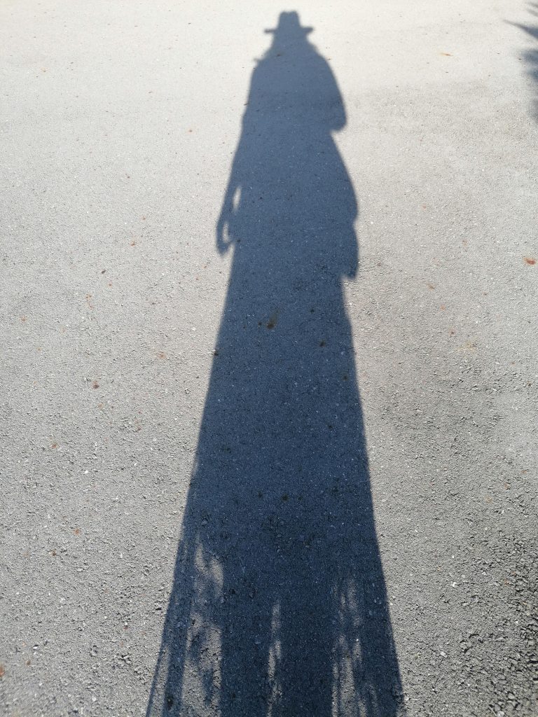 Da ich nichts anderes dabei habe, ziehe ich mir meine Regenjacke über die Schultern, damit diese bedeckt sind. Das wird mich begleiten, solange ich in Asien bin, Beine und Schultern gehören in Tempeln etc. bedeckt. Mein Schatten sieht aber eher nach wildem Westen aus, als nach kambodschanischem Tempel.